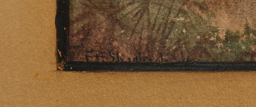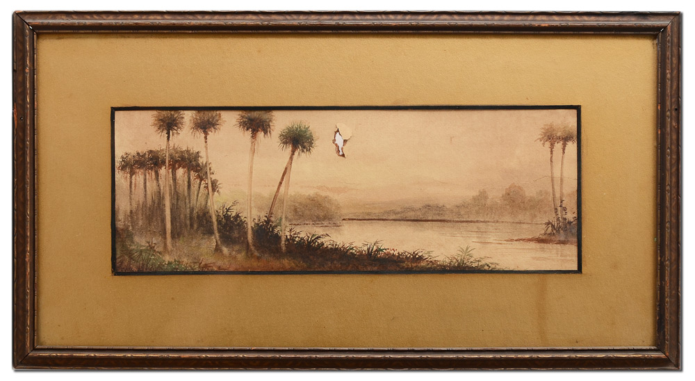SHAPLEIGH, Frank Henry, (American, 1842-1906): ''St. Augustine, 1890'', The River and Palms, Watercolor, Sight size 4 1/2'' x 12 3/4'', signed lower left, older label affixed verso, original wooden frame with wear 10'' x 18 1/2''.