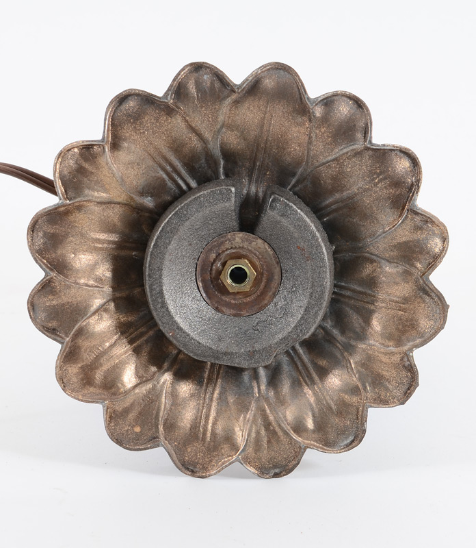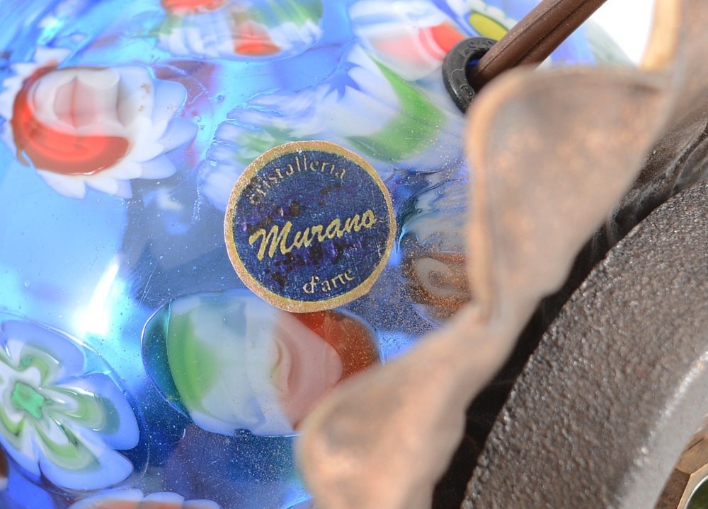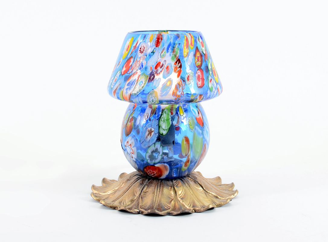 BLUE MILLIFIORI MURANO GLASS BOUDOIR LAMP: Mushroom form stretched millifiori glass on cast metal floral base, 7 1/4'' x 6 3/4''.