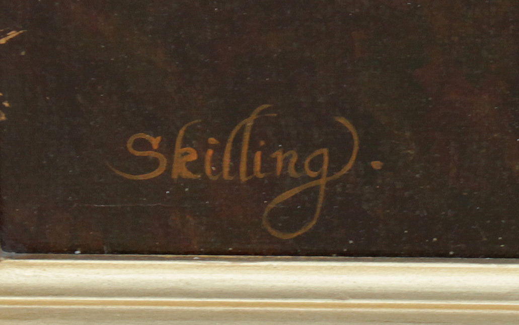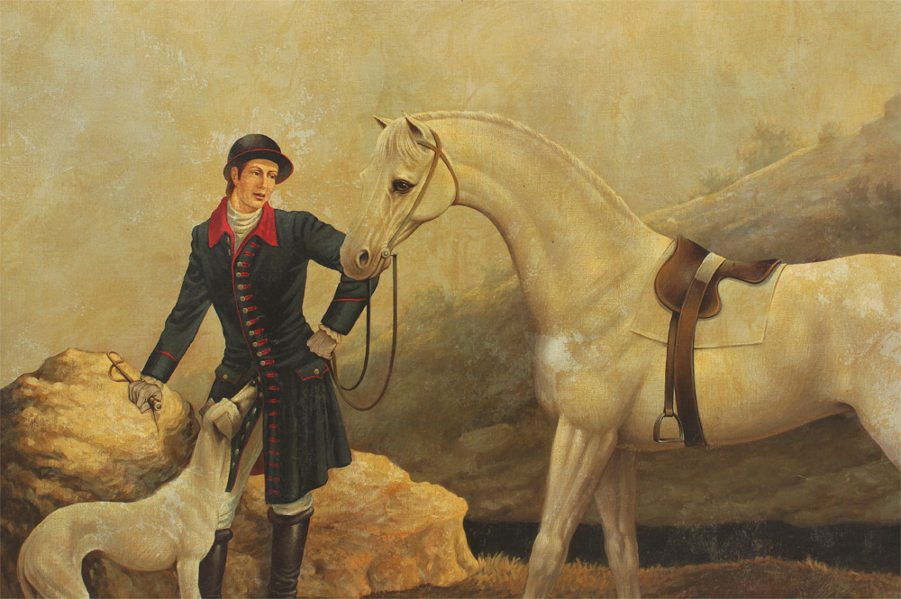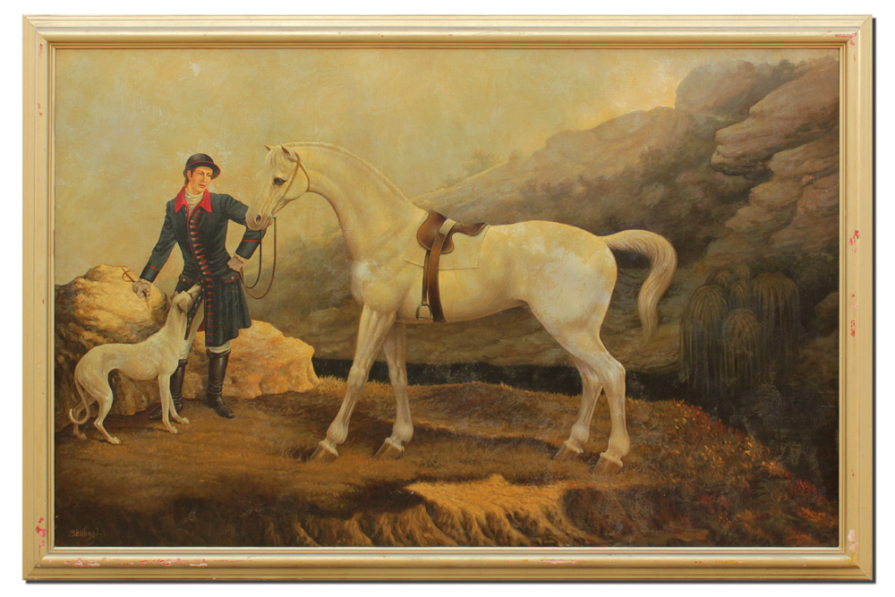 SKILLING, William, (American-British, 1862-1964): Equestrian Portrait of a White Horse, Rider, and White Dog, Oil/Canvas, 42 1/2'' x 66 3/4'', signed lower left, painted frame with wear 48'' x 72''.