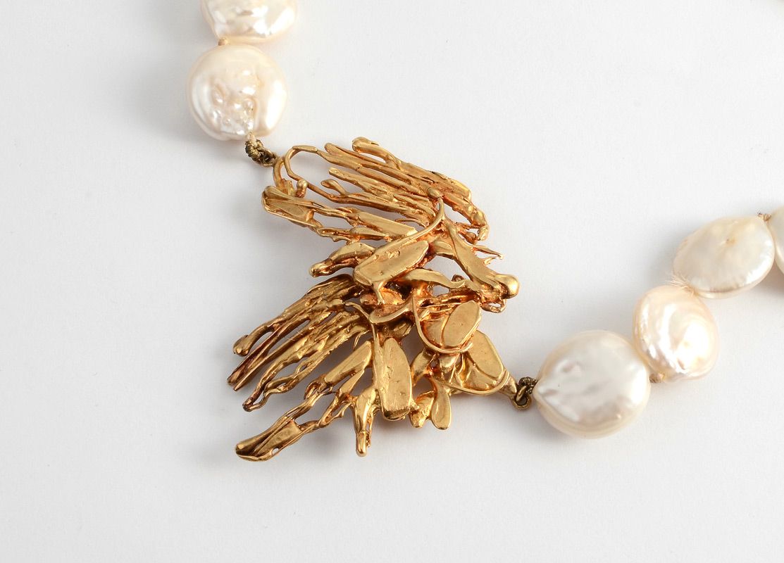 18K GOLD CLASP COIN PEARL NECKLACE: 26 iridescent white flat coin pearls with an 18K yellow gold freeform double clasp. Length 19''. Gold weight approx. 30 grams.
