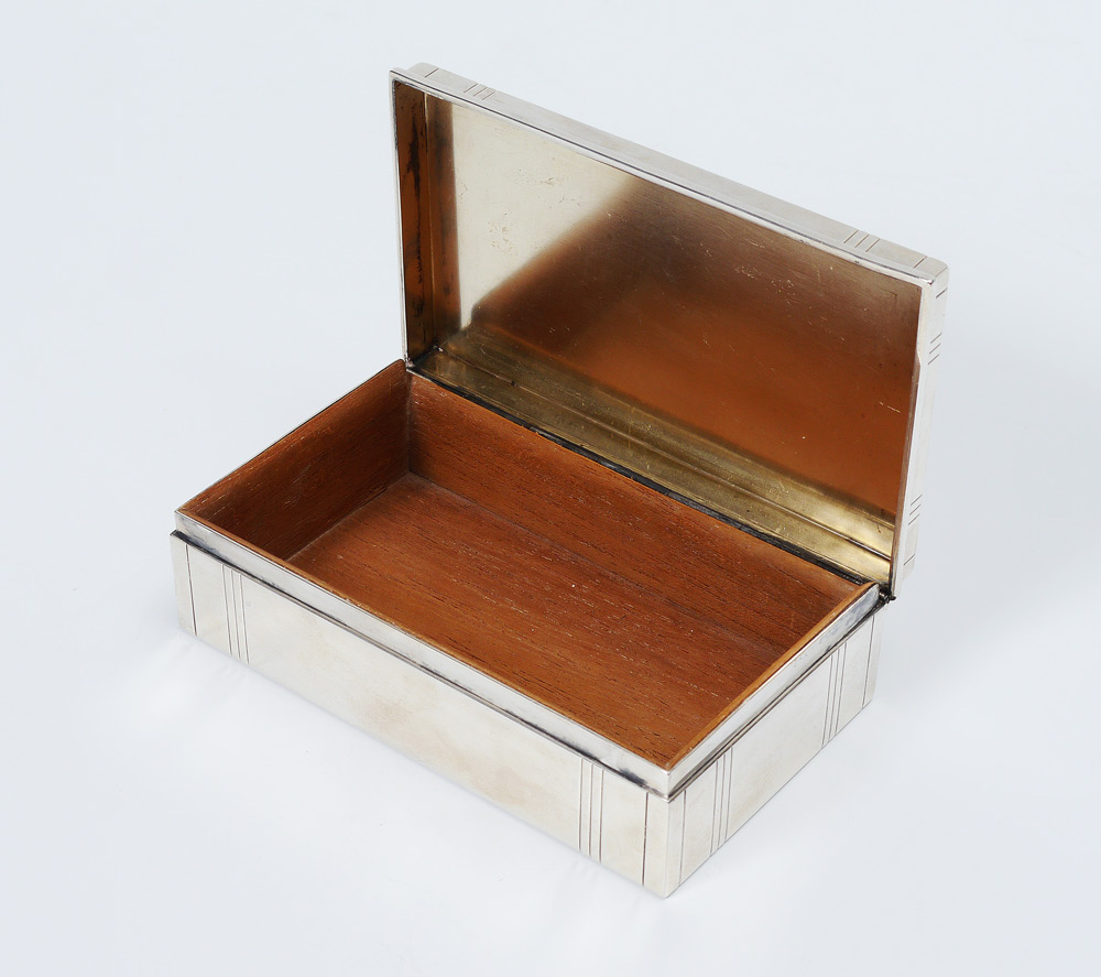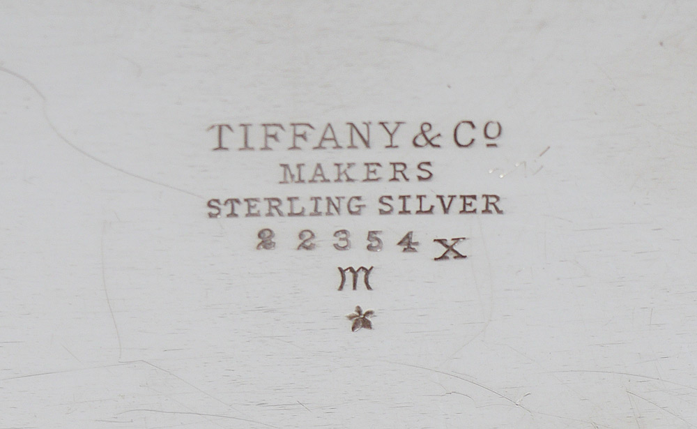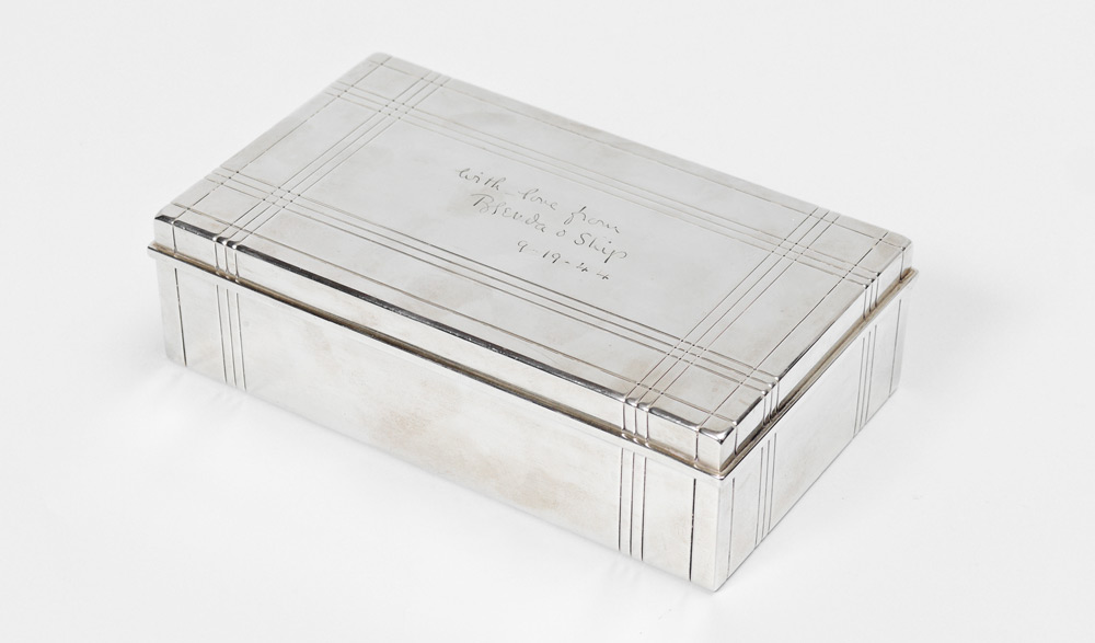 TIFFANY & CO STERLING PRESENTATION BOX: Box with hinged lid, wood lined interior. Family tradition holds this box was presented to John Jacob Astor II from Brenda Frazier & Shipwreck Kelly, engraved on top ''With love from Brenda & Ship, 9-19-44''. Marked on base Tiffany & Co., Makers, Sterling Silver, 22354, X, M. Measures 1 3/4'' h. x 6' x 3 5/8''. Overall 13.7 troy oz inclusive with wood lining.