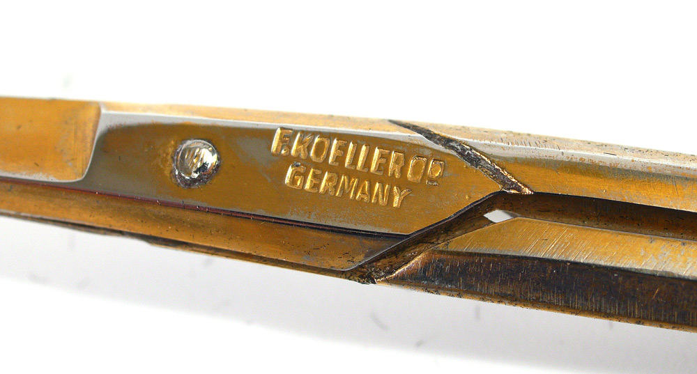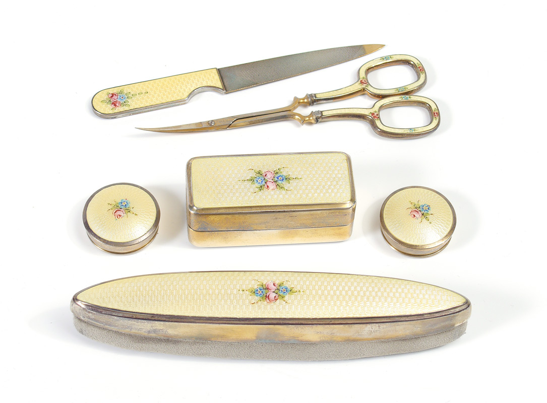1920'S GUILLOCHE ENAMELED MANICURE SET: 6 piece with ivory colored and floral decorated guilloche enamel decoration to include nail file (4 1/2''), nail scissors marked F. Koeller Co., Germany (4 3/8''), nail buffer marked Sterling (5 1/4''), 2 round boxes marked Sterling (1'' dia.), covered box (2 1/4'' x 1''). Sold with fitted leather case, monogrammed, 1 5/8'' x 5 3/4'' x 3 1/4''.