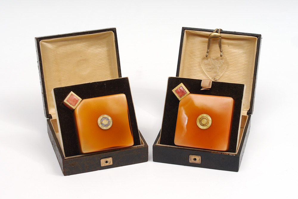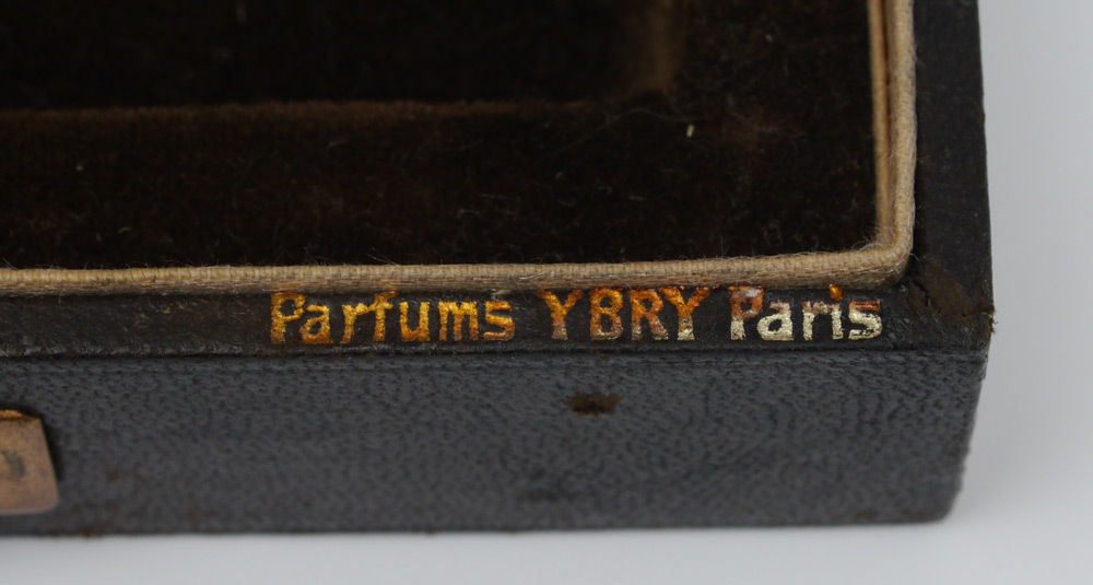 PAIR FRENCH GLASS PERFUME BOTTLES IN ORIGINAL BOXES: Marked ''Devinez Ybry Paris'', in original boxes marked ''Parfums YBRY Paris''. One box has, intact, the tassel fastener with dancing cupid etched glass heart. Boxes measure 1 3/4'' x 13/8'' x 4 1/4''.