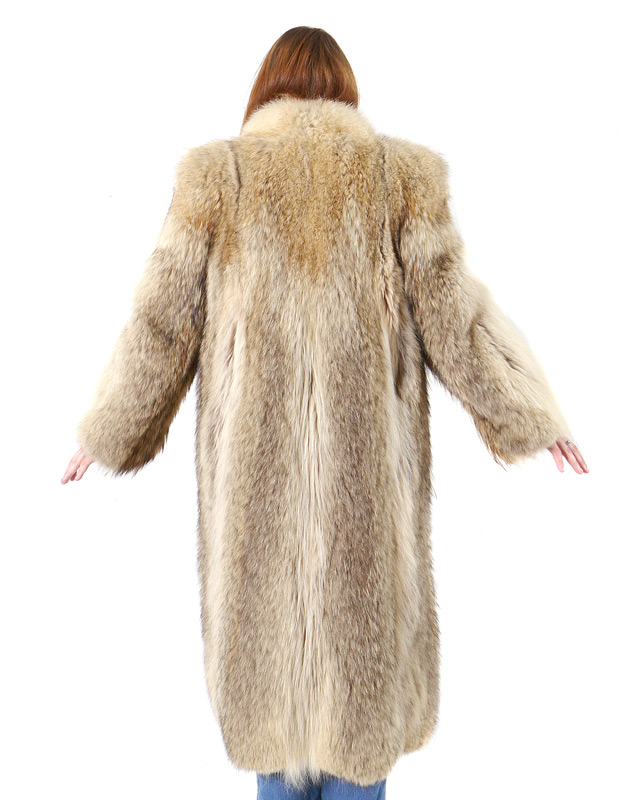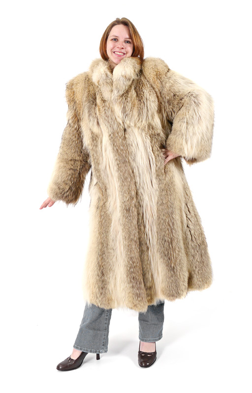 COYOTE FUR FULL LENGTH COAT: Very plush coat with generous collar. Purchased at Dittrich of Detroit. Measures approx. 48'' collar to hem, 20'' shoulder to shoulder, 22'' outside sleeve.