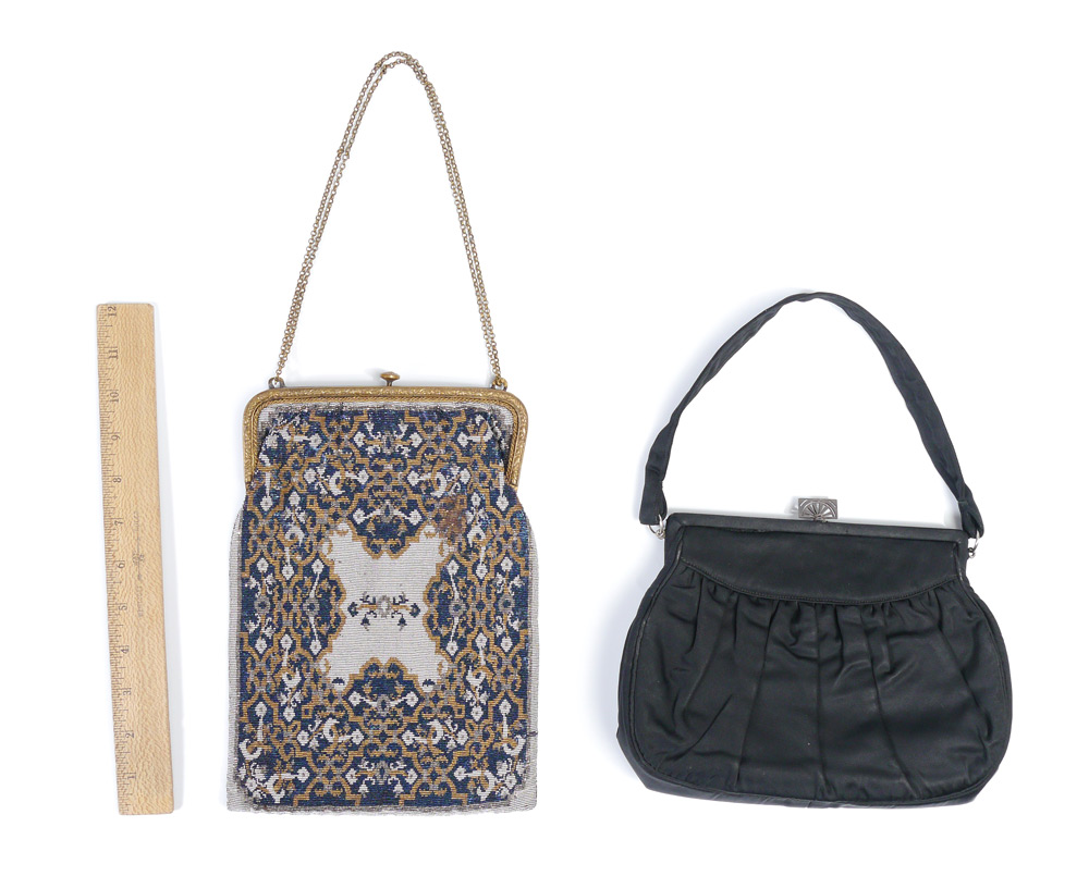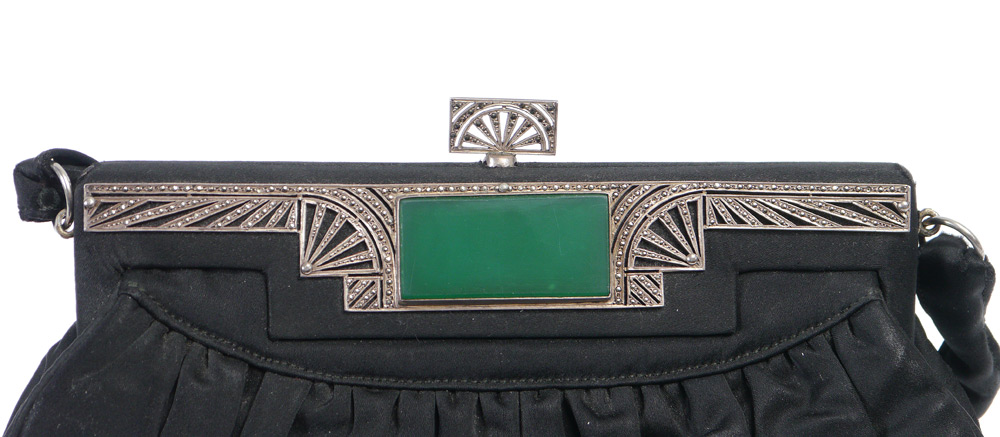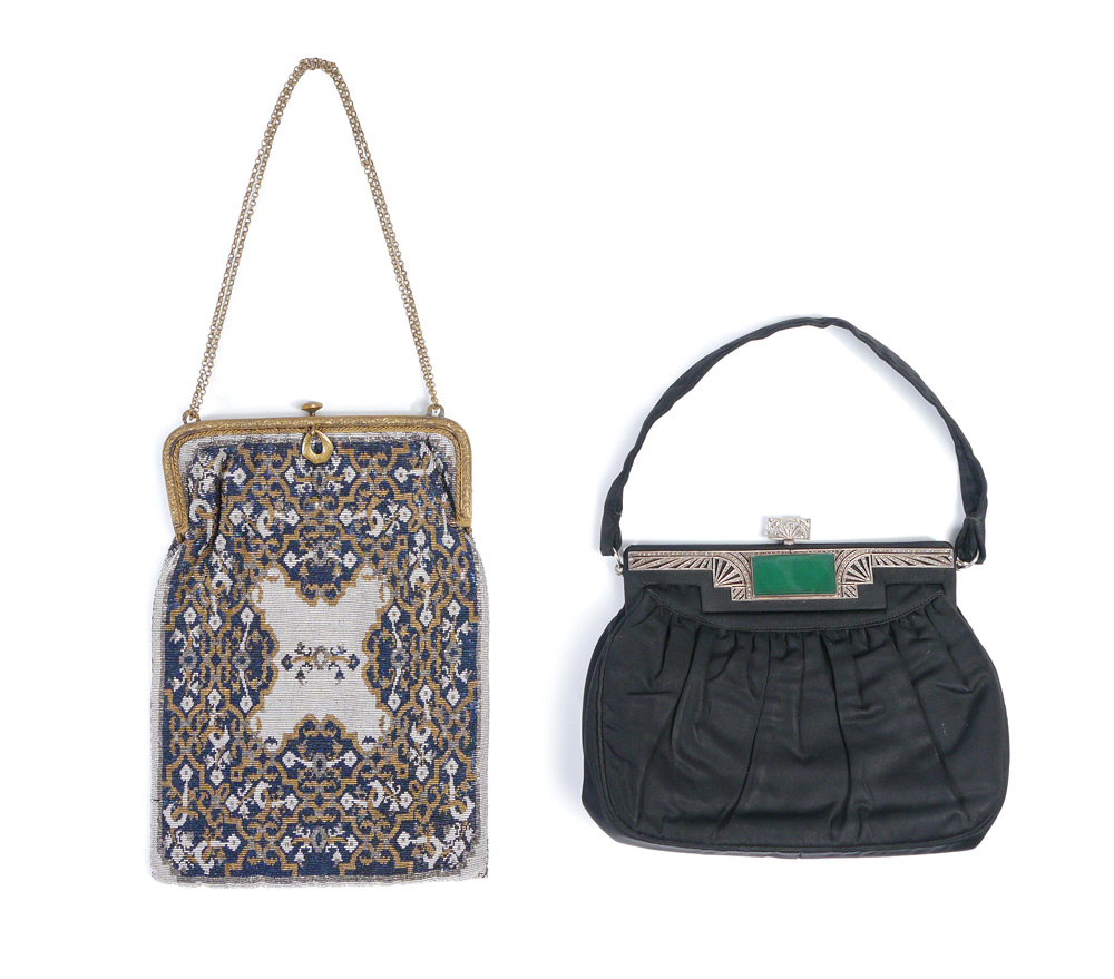 2 ART DECO PURSES CA. 1920'S: 1) Sterling, marcasite and chrysoprase detail on black evening bag, 6 1/2'' x 9''. 2) Deco blue, silver and gold colored cut steel beaded bag, 12'' x 7 1/2''.