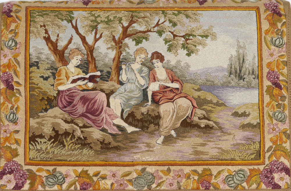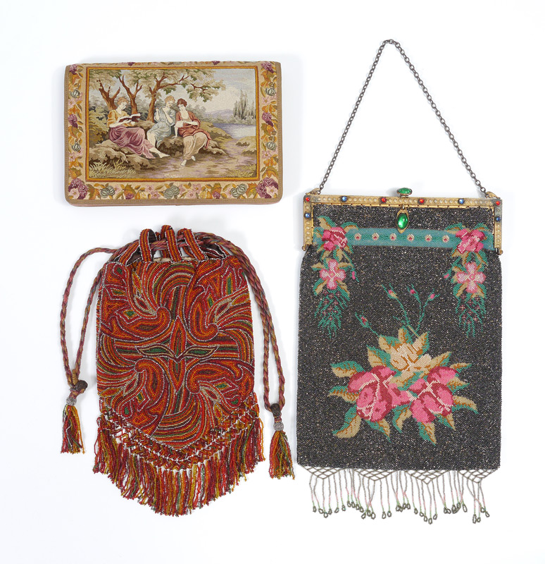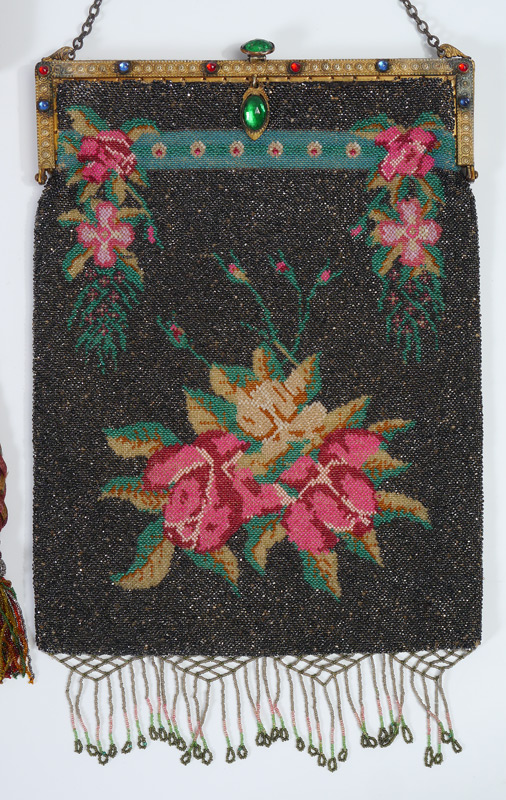 3 EXQUISITE 1920'S PURSES: 1) Floral & Black Background beaded bag, the frame set with colored stones, excluding chain and fringe measures 11 1/2'' X 8 1/2''. 2) Never used hand embroidered Dutch clutch purse, moire' interior. 3) Art Nouveau draw string beaded Bag with new silk pangee lining, 8'' x 6'', excluding fringe.