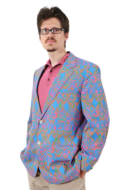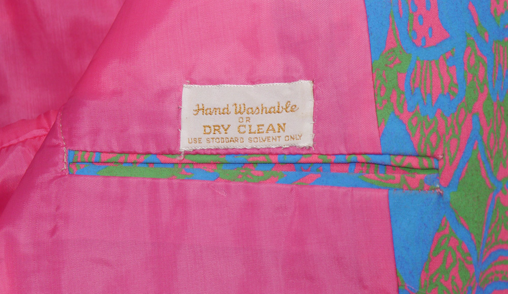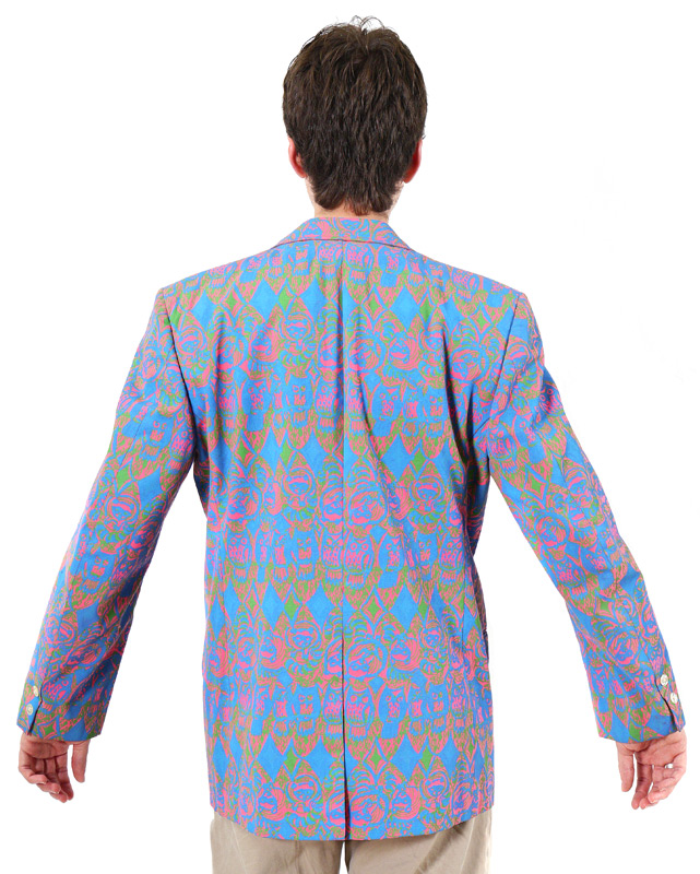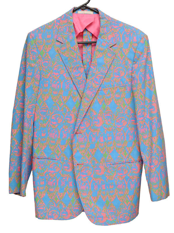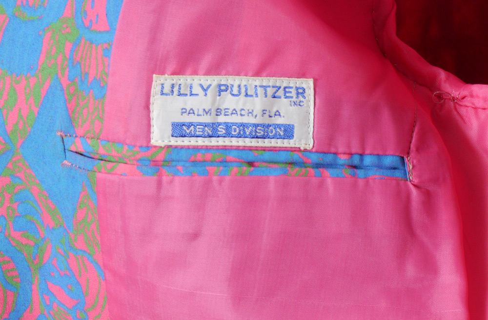 VINTAGE LILLY PULITZER SPORTS COAT: Vibrant design featuring repeating owls, raccoons and diamonds. Tagged Lilly Pulitzer, Palm Beach, Fla., Men's Division. 18 1/2'' across shoulders, 24 1/2'' sleeves to shoulder, 30 1/2'' long overall