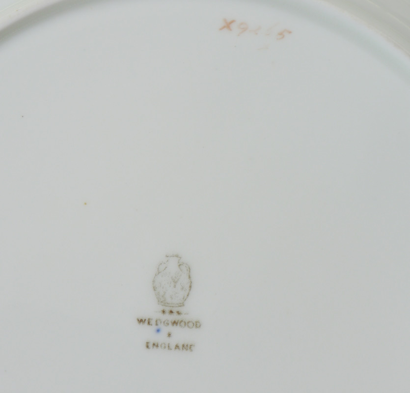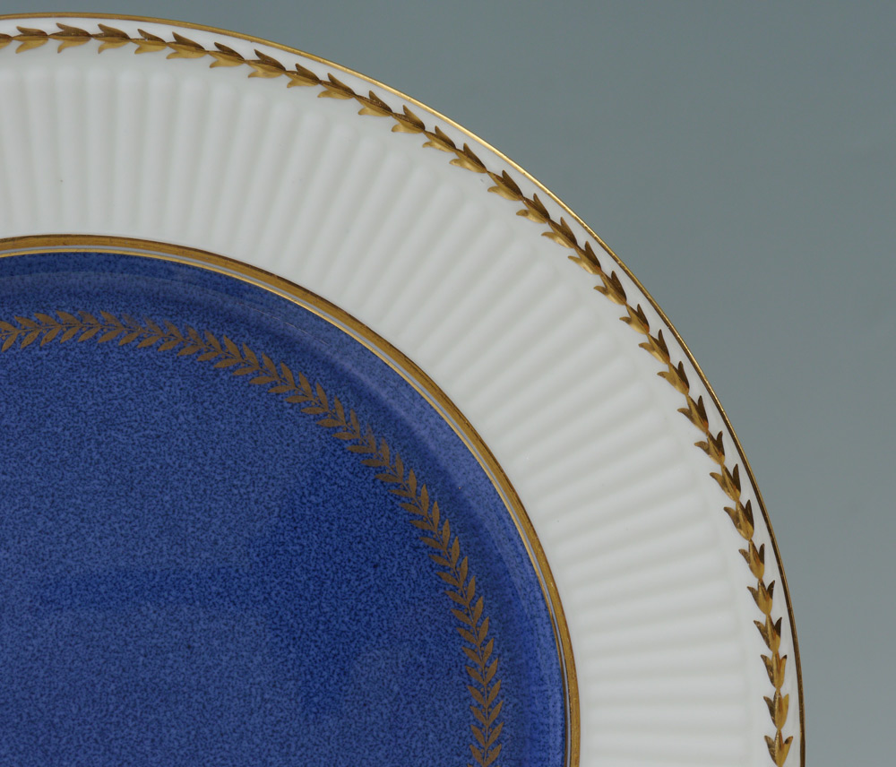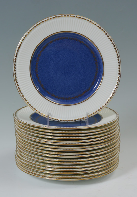 SET OF 18 WEDGWOOD FINE CHINA SERVICE PLATES: Fluted border with gold rim and blue center, 10 1/2'' dia.. Estate of Elton Hoyt II
