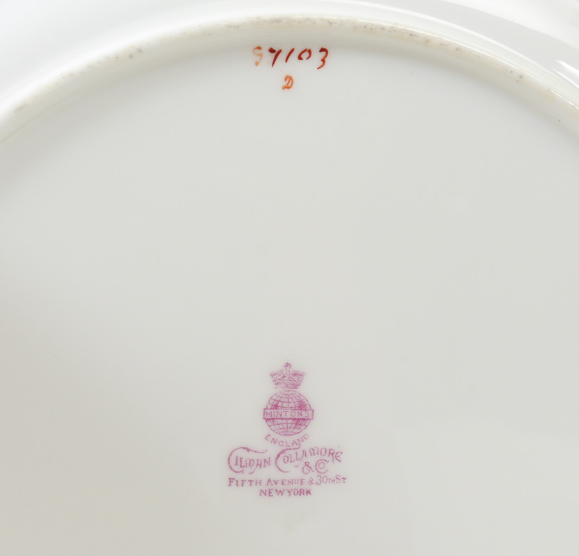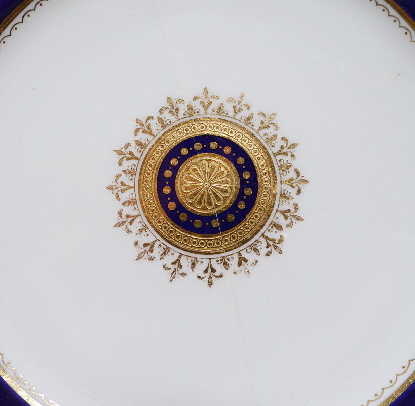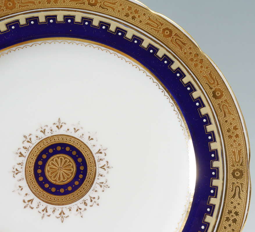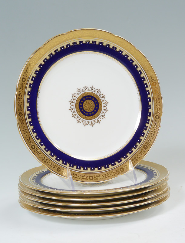 SET OF 6 MINTON SALAD PLATES: Gold and cobalt on fine white china. Retailed by Gilman Collamore & Co., Fifth Ave New York. 8 3/4'' dia.. Estate of Elton Hoyt II