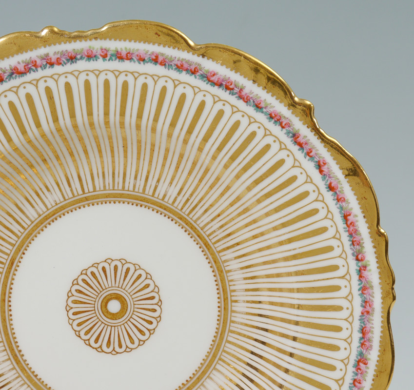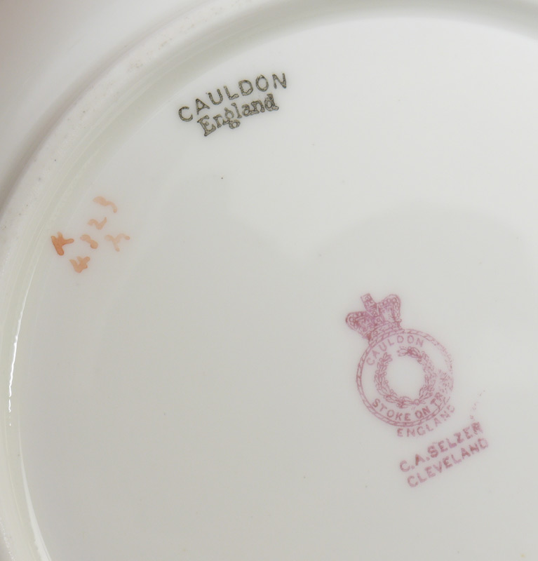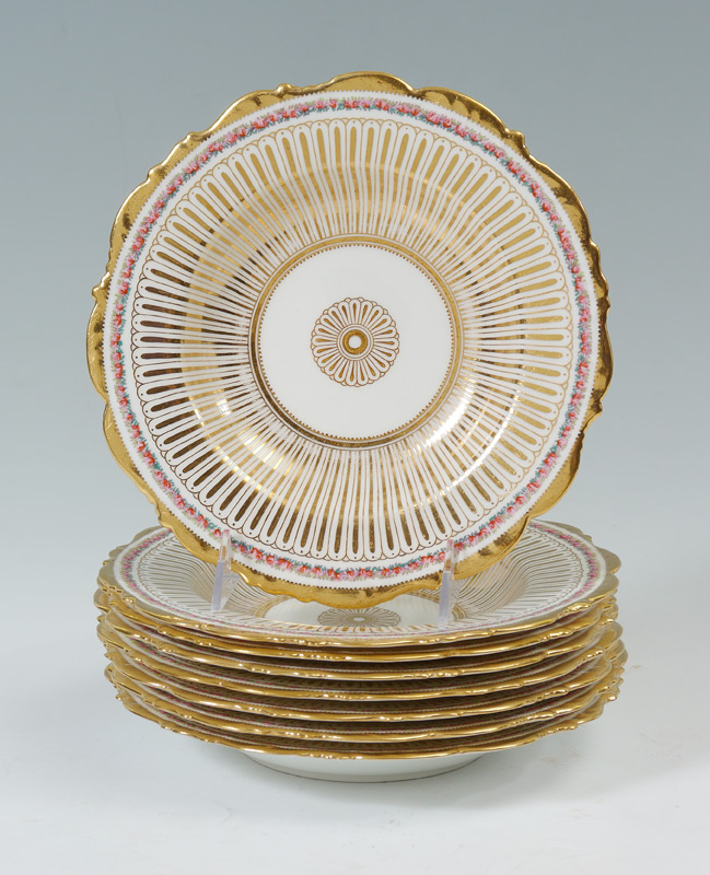 SET OF 8 CAULDON FINE CHINA LOW SOUP BOWLS: Rich in gold decoration with subtle floral rim. Retailed by C.A. Selzer in Cleveland. 8 3/4'' dia.. Estate of Elton Hoyt II