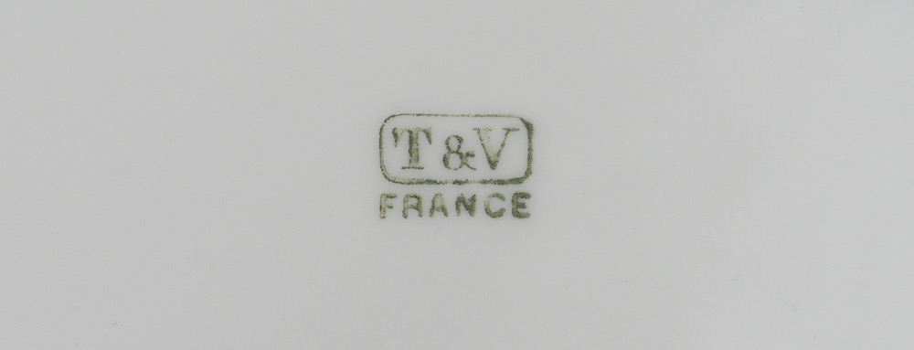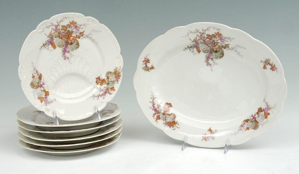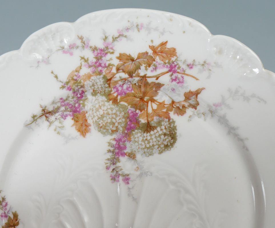 FRENCH LIMOGES CHINA ARTICHOKE SET: All with floral Hydrangea decoration. Platter marked Limoges France (13 5/8'' x 10 1/2''). 4 plates with Coiffe mark, 1 with Tressemann & Vogt mark (9 1/4'').