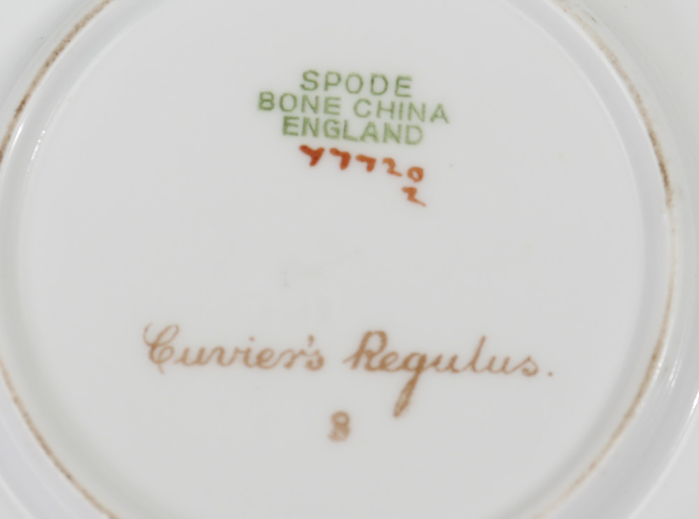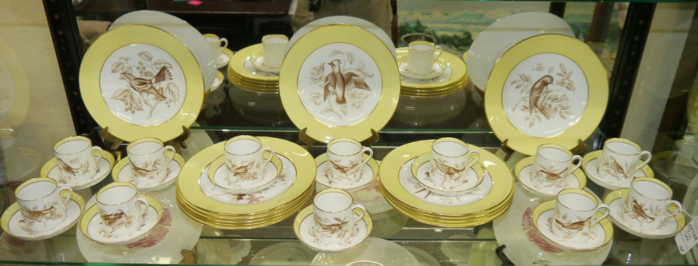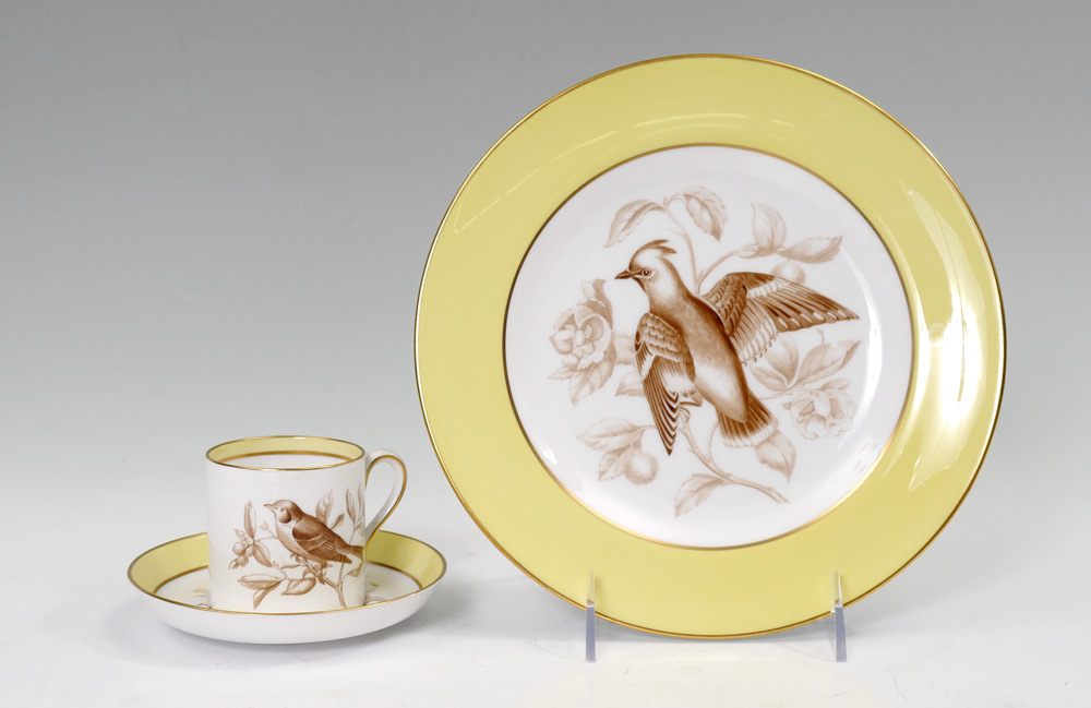 SPODE BIRD DECORATED CHINA LUNCHEON SET: 36 pieces to include 12 plates (9''), and 12 demi-tasse cups and saucers.