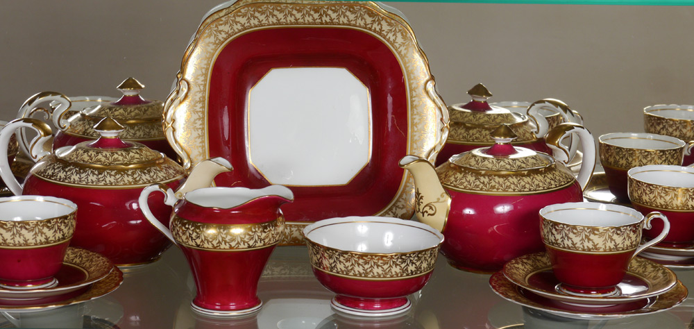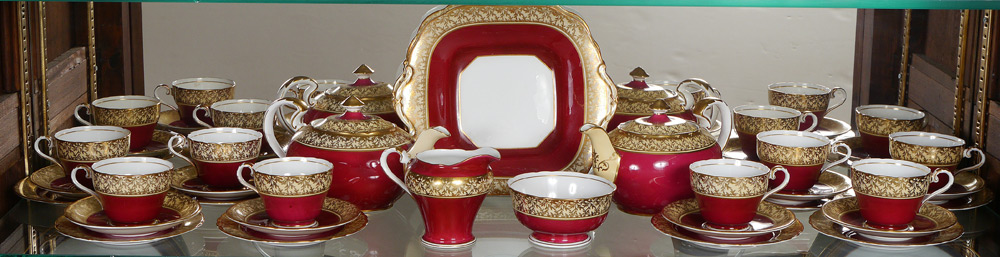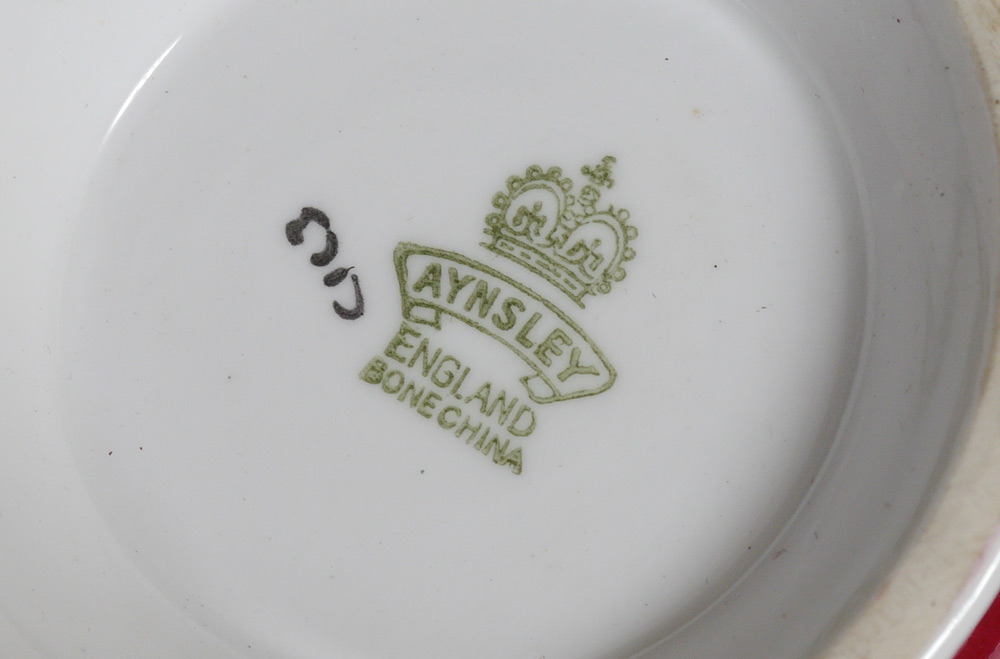 AYNSLEY FINE ENGLISH CHINA DESSERT SET: 29 pieces to include 2 tea pots, cake plate, cream pitcher, sugar, 8 cups, 8 saucers and 8 plates (6'' dia.).