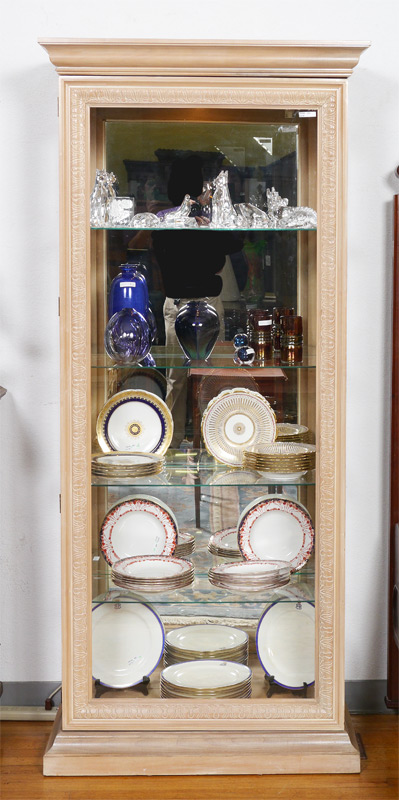 UPRIGHT ILLUMINATED CURIO DISPLAY CABINET: Carved frame around front glass, illuminated interior with 4 glass shelves. 76'' h. x 34 1/4'' x 15 1/4''.