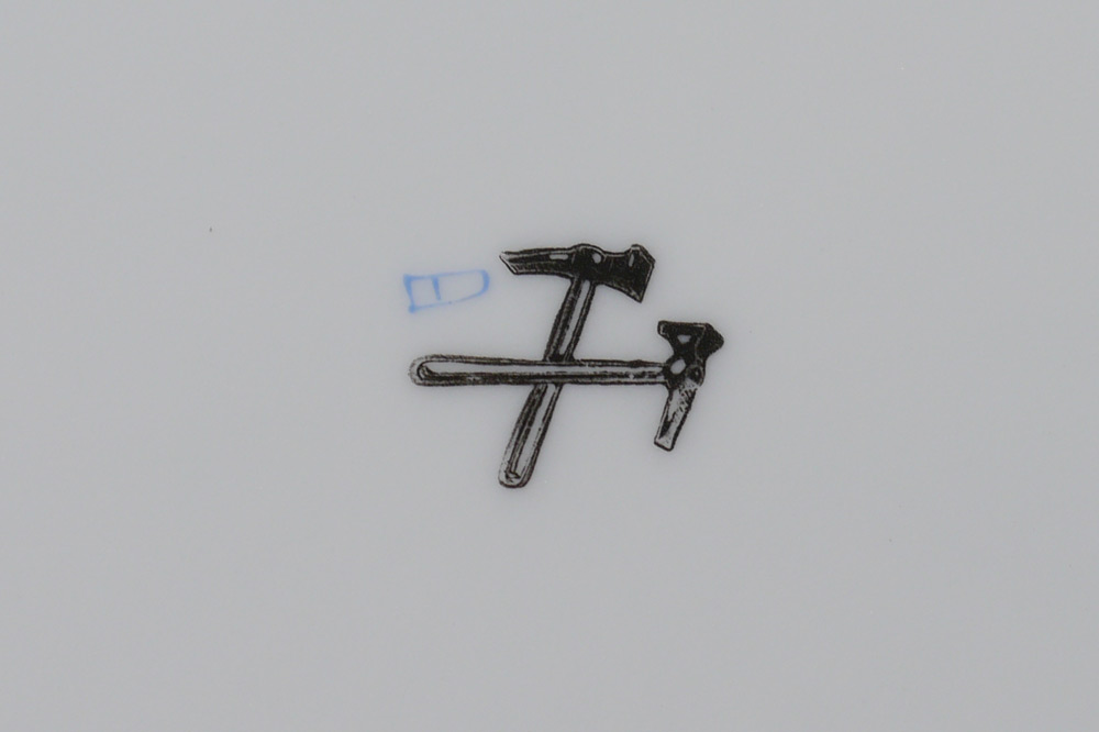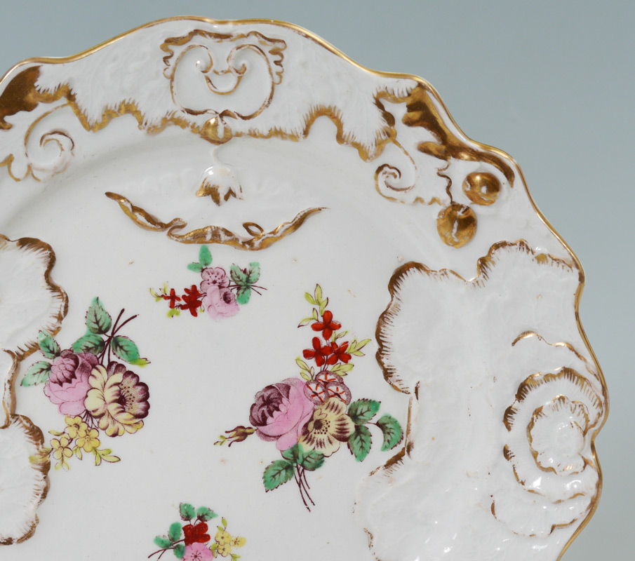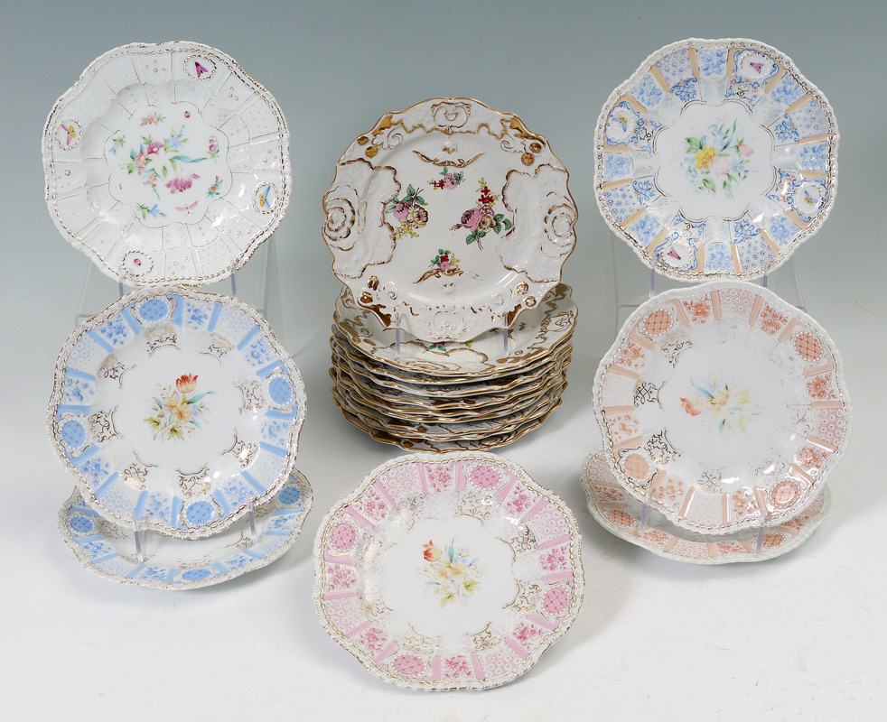 7 BOHEMIAN PLATES & 10 ENGLISH FLORAL PLATES: To include 1) 7 Fischer & Mieg, Pirkenhammer, plates with embossed scalloped rim, floral center. Crossed hammer underglaze mark. 8 1/2'' dia. 2) 10 plates with embossed gilt shaped rim, floral decoration. Impressed lion and unicorn mark. 8 1/2'' dia. Estate of Elton Hoyt II