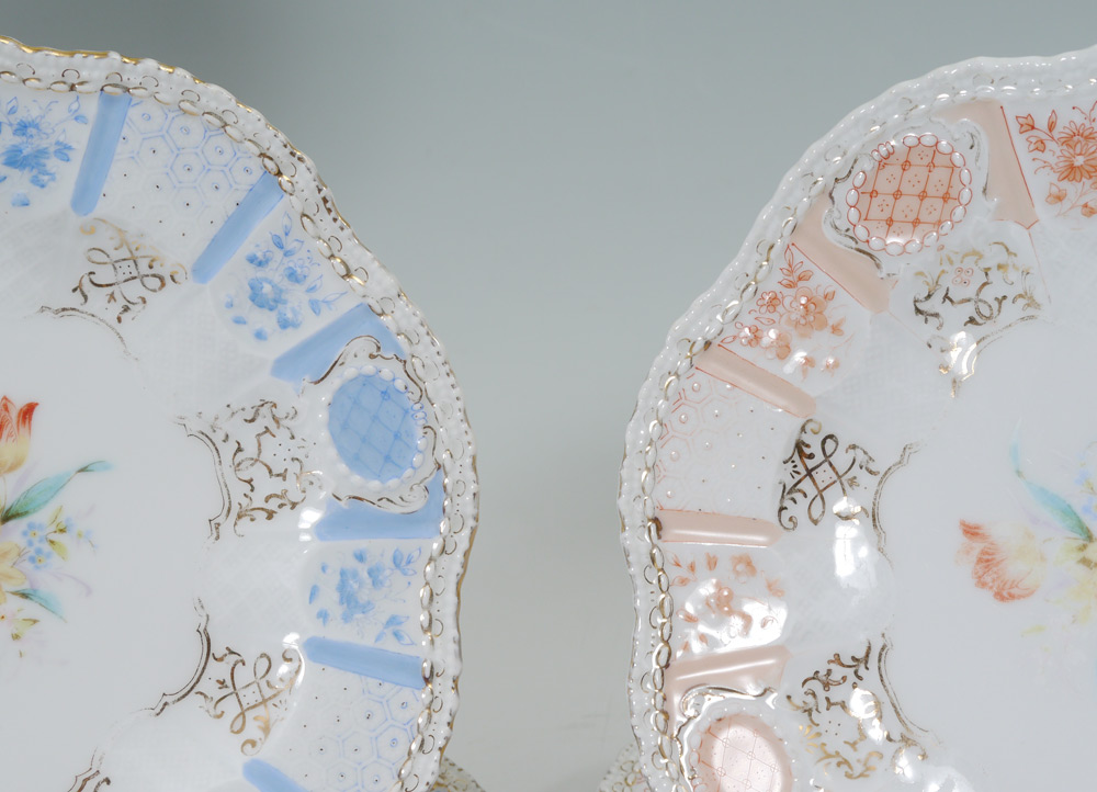 CONDITION: Both with loss of gilt and decoration. Sold with an addition Fisher & Meig plate with a crack.