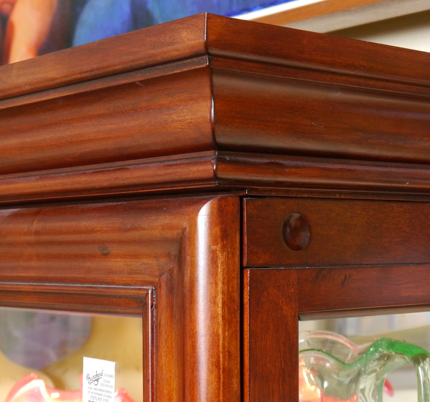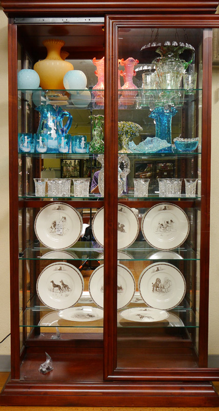 ILLUMINATED CONTEMPORARY CURIO CABINET: Sliding glass door front, illuminated interior with mirrored back, 5 adjustable glass shelves. 80 3/4'' h. x 43 1/2'' x 16 1/2''.