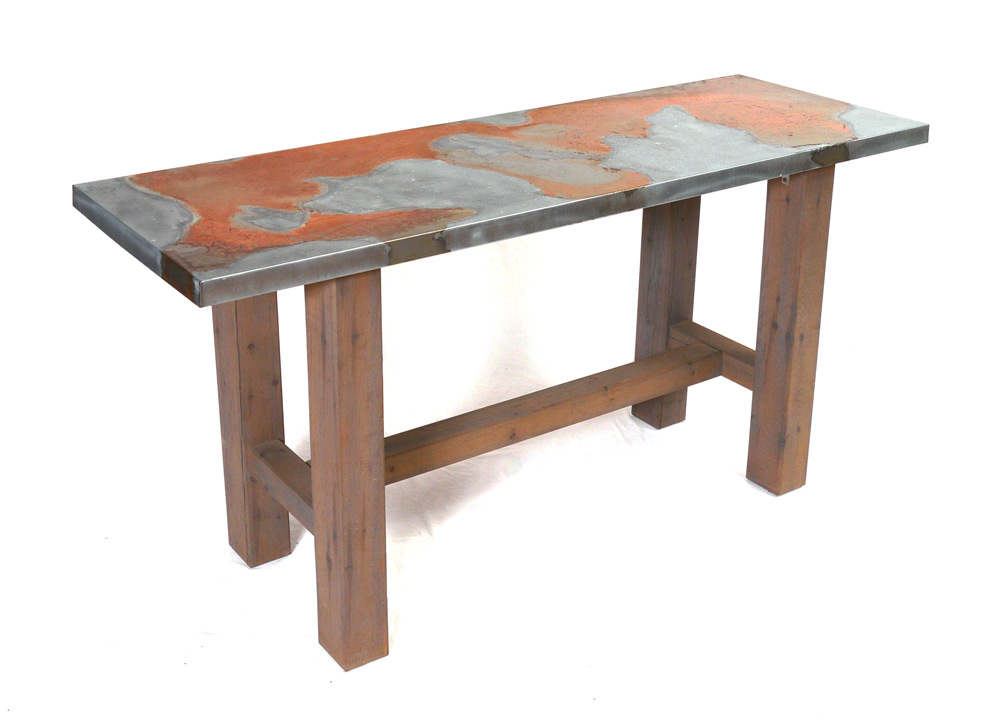 MODERN WOOD & METAL HALL TABLE: Steel clad top with free form acid etched decoration, allowed to rust. On 4 post legs with stretcher. Overall 30 1/4'' h. x 60'' x 18''.