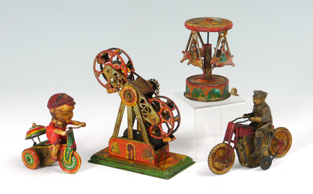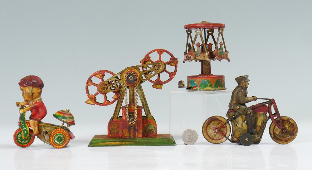 COLLECTION OF 4 TIN LITHO TOYS: 4 pre-war tin lithograph toys to include 1) Child on tricycle, key wind, working, 4 1/4'' h. x 3 3/4''. 2) Double ferris wheel with riders, key wind, working, 7'' h. x 5 1/4'' x 2 3/4''. 3) Carousel with 4 riders, lever action, working, 4 3/8'' h. x 3''. 4) Motorcycle rider with uniform, key wind, working, 4 1/4'' h. x 5 3/4'' x 1 3/4''.