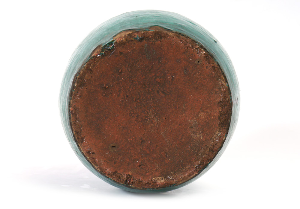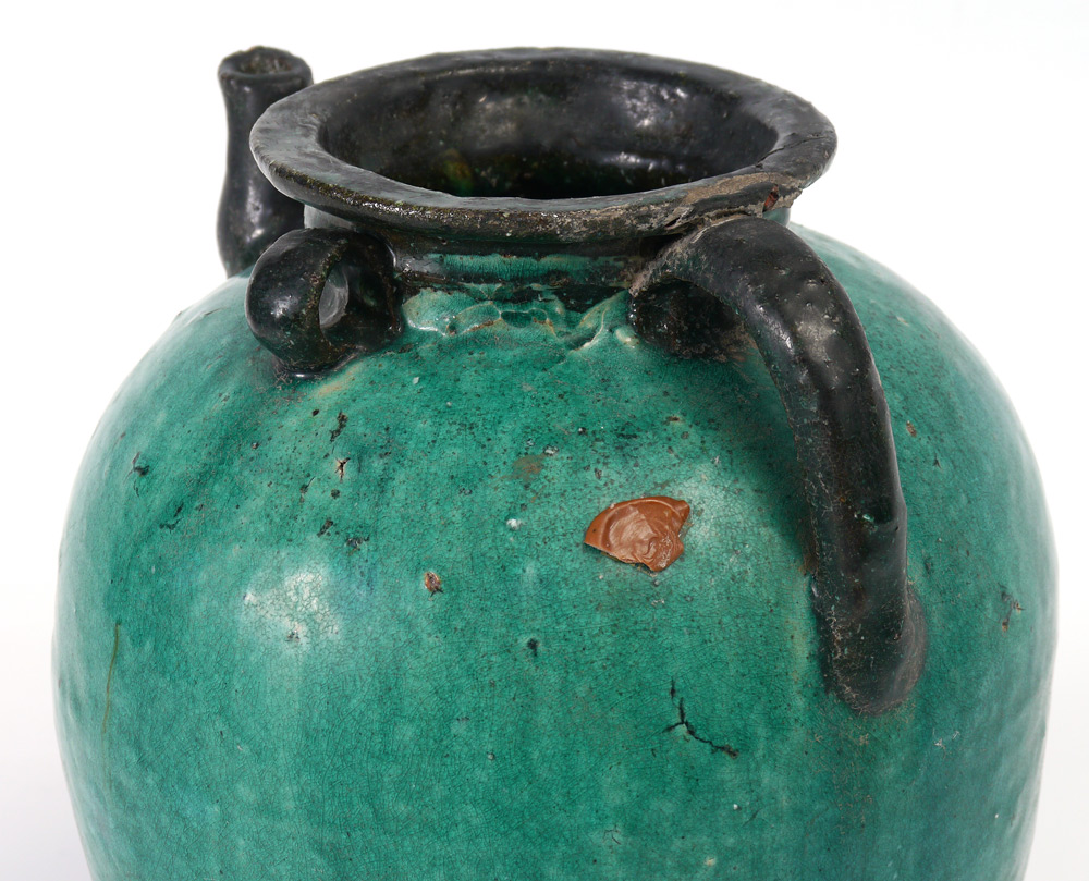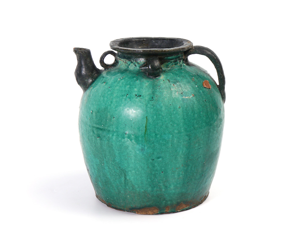 CHINESE JIANG XI WINE JUG: Ca. 1920's. Green glaze stoneware, partial wax seal is intact. Measures 9 1/2'' tall.