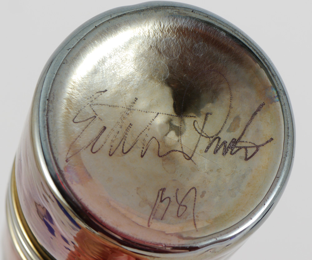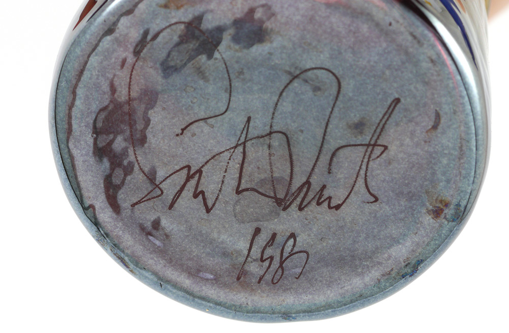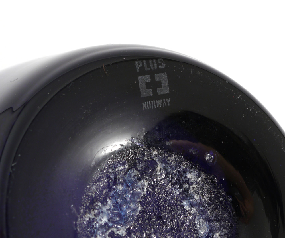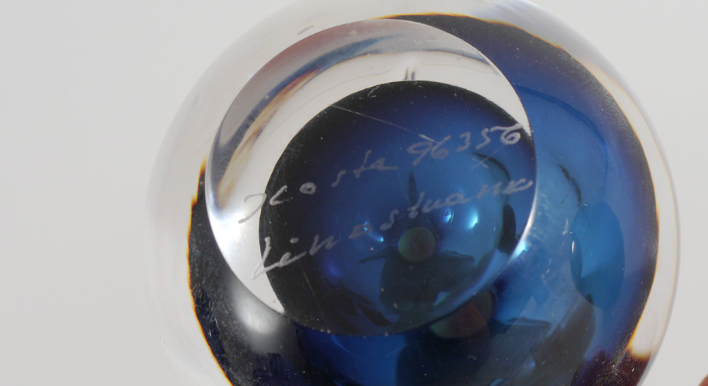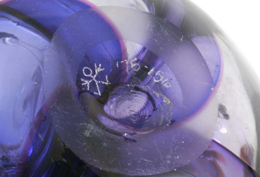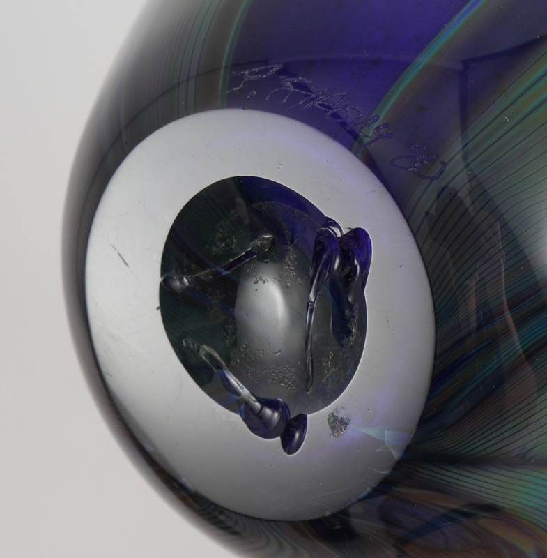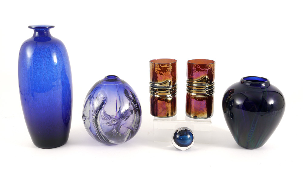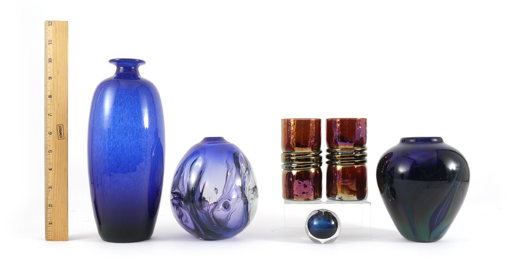 6 PIECE COLLECTION OF CONTEMPORARY ART GLASS: 6 pieces to include 1) Paul Manners vase, etched stick figure mark, 75-156, 5 7/8'' h. x 5''. 2) Plus Norway patterned cobalt vase, 10 1/8'' h. x 4 1/2''. 3) Randy Strong vase with deepest cobalt glass with rainbow hued pulled feather designs, signed, 5 3/4'' h. 4) Kosta Lindstrand paperweight / pen holder, signed, 2'' dia. 5-6) Pair illegibly signed iridescent vases with applied design, 4 7/8'' h. x 2 1/2.