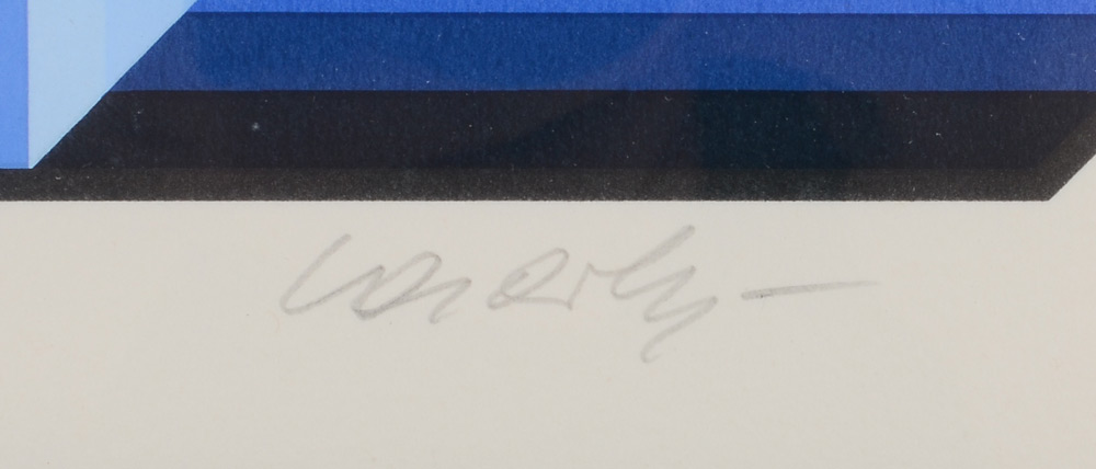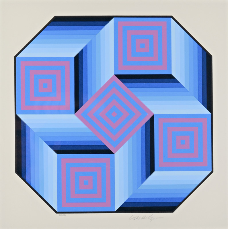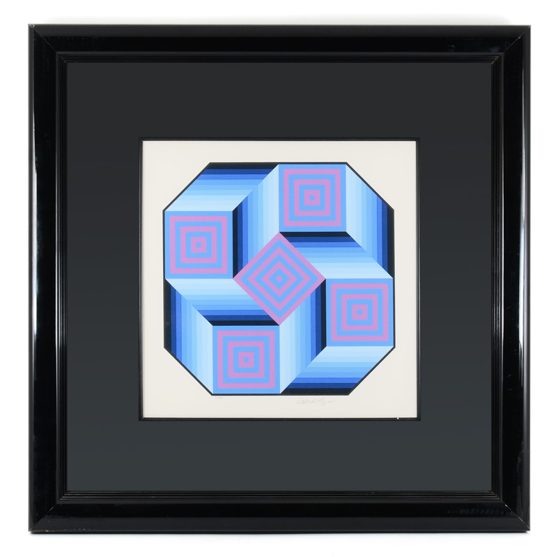 VASARELY, Victor, (French-Hungarian, 1906-1997): ''Octa'', Serigraph, Sight size 14 1/2'' x 14 1/2'', pencil signed lower right, #'d 128/300, black lacquer frame with wear 26 1/2'' x 27''.