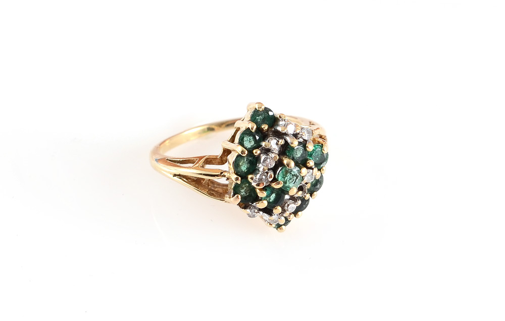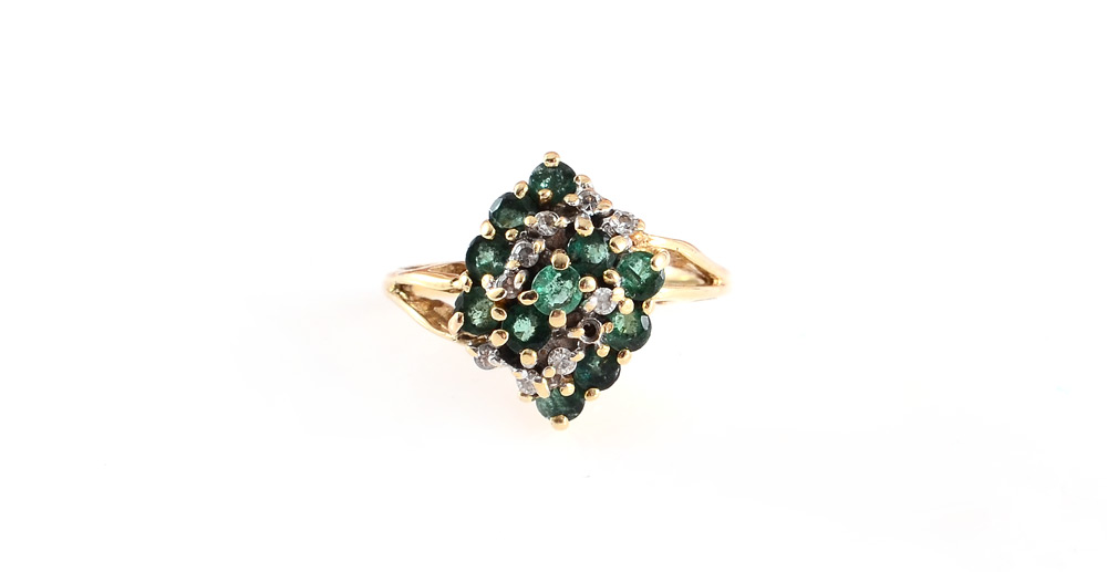 14K DIAMOND & EMERALD RING: 14K yellow gold ring contains 11 round emeralds totaling approx. .45 Ct. and 9 round single cut diamonds totaling approx. .09 Ct. One diamond is missing. Weight: 4.1 grams. Size: 5.