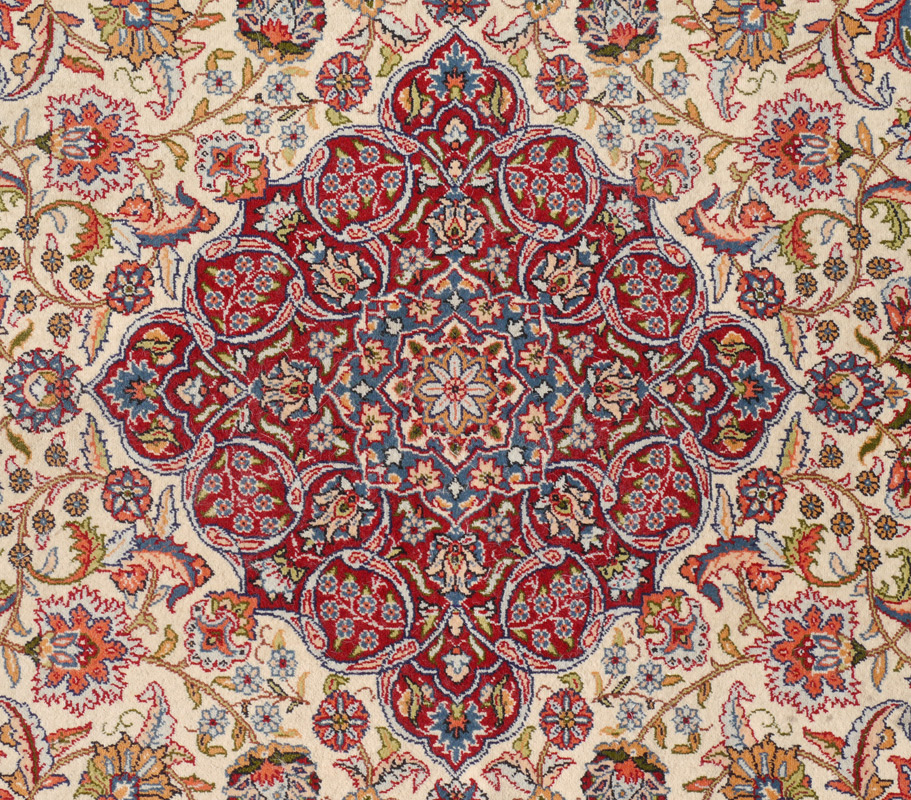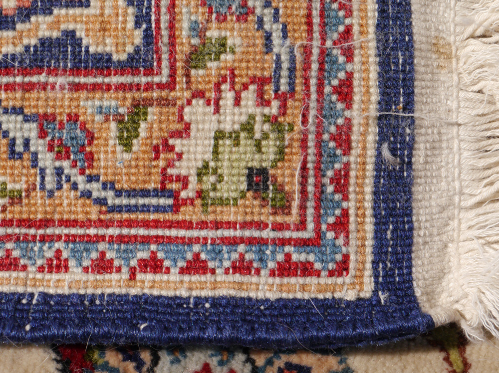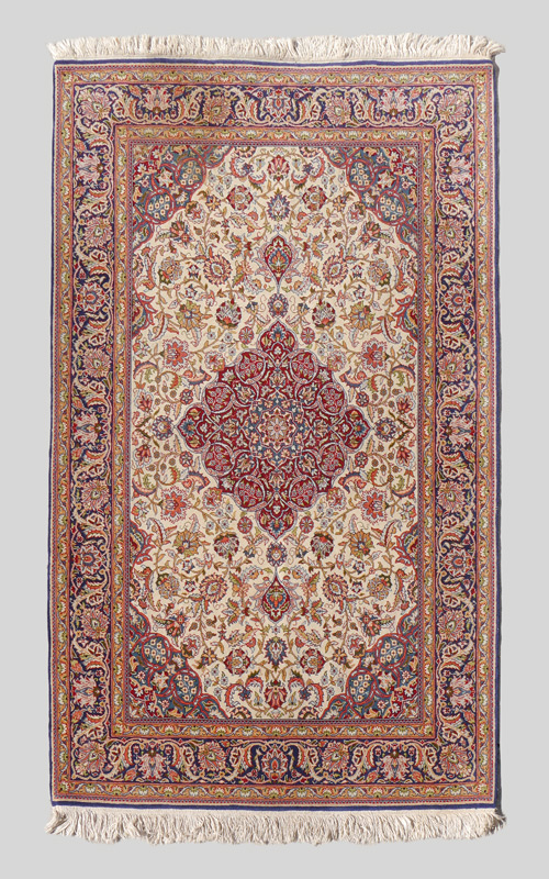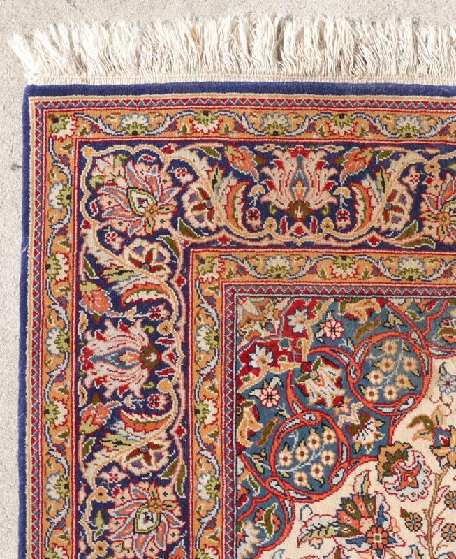 SEMI-ANTIQUE PERSIAN DESIGN HAND KNOTTED WOOL RUG, 4' 2'' x 6' 7'': This rug has a traditional central diamond shaped medallion with spandrels dangling from either end. The red ground of the medallion makes it look like a jewel set in the ivory field of the rug. The balance of the field is covered with a colorful array of flowers, palmettes, leaves, and vines. The main border has a blue background that has a design of palmettes alternating with large leaves. Condition is good.