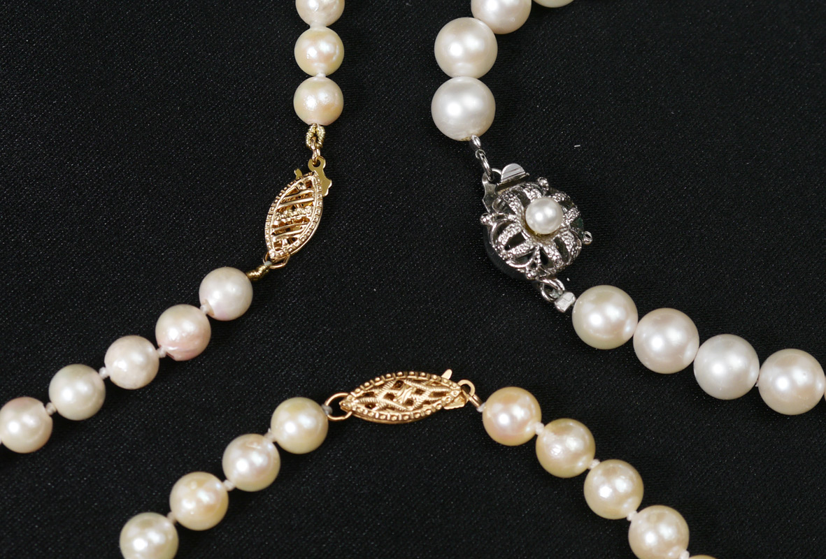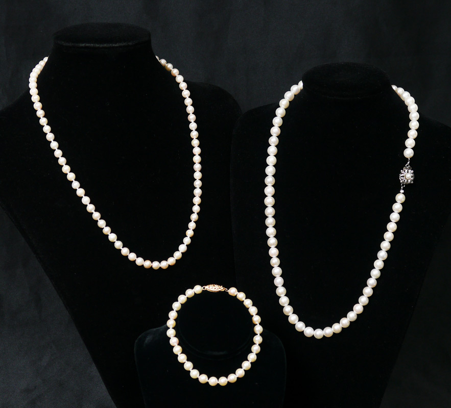 ESTATE PEARL JEWELRY: 18'' pearl Necklace and a 7.5'' Bracelet, 5.50-6.00mm pearls to necklace and 6.00mm pearls to bracelet with same quality pearls. Blemished, cream in color, low luster, both with 4K filigree clasp. Some of the pearls are peeling. And an 18'' cultured freshwater pearl stand, 6.50-7.00 mm, white in color, with non gold clasp. Sold as a lot.