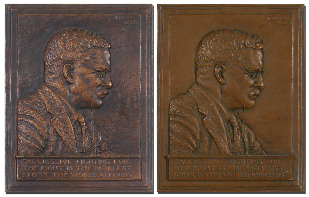 FRASER, James Earle, (American, 1876-1953): 2 Bas-Relief Bronzes of Theodore Roosevelt, 12 3/4'' x 10'', signed in the upper right, one is labeled verso, essentially the same casting with different patinas.