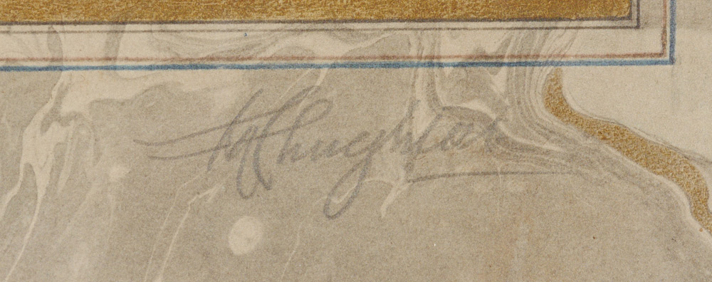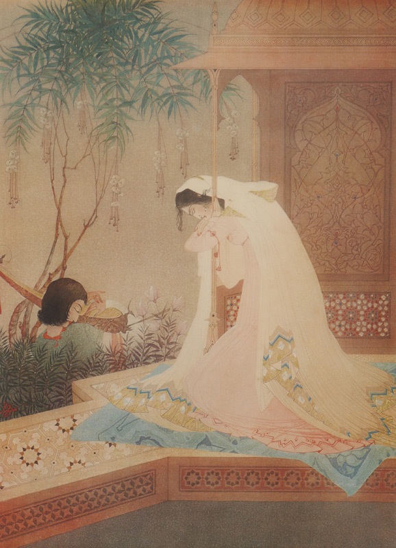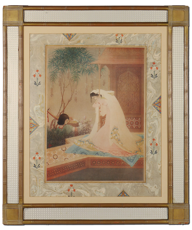 CHUGHTAI, Abdur Rahman, (Pakistani, 1897-1975): ''For a Song'', Offset Lithograph, Sight size 27 1/2'' x 22 1/4'', pencil signed lower right, encased in painted and carved faux bamboo frame with wear 36 1/2'' x 32''.