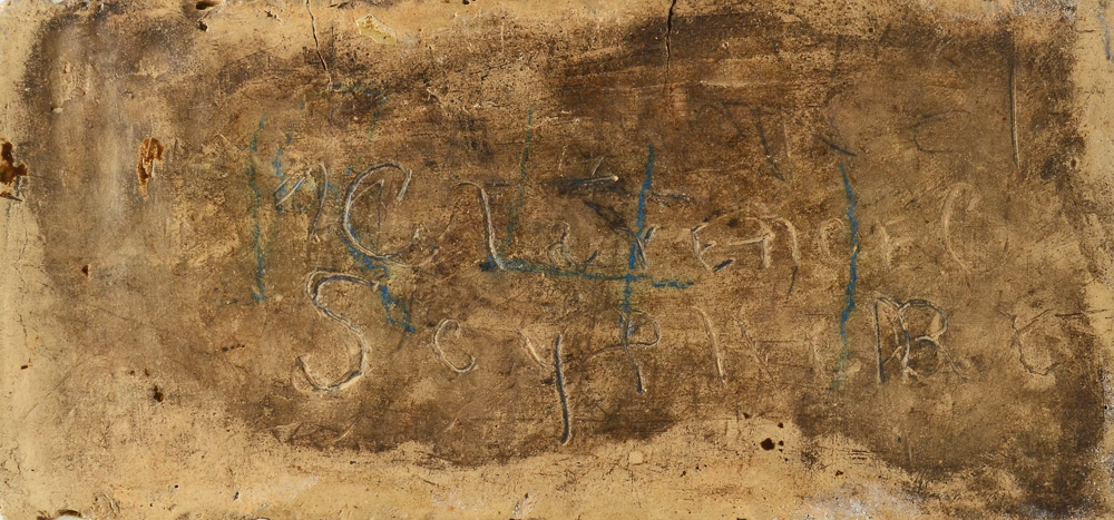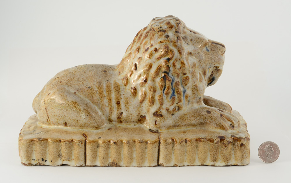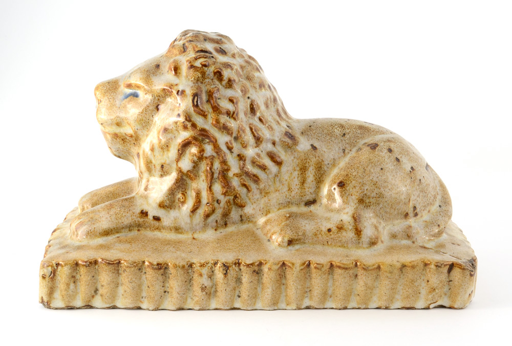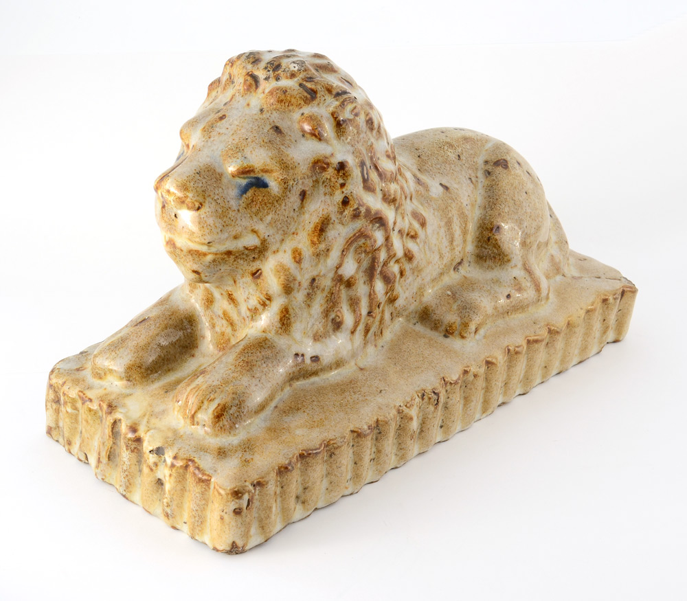 FOLK ART SEWER TILE RECLINING LION: Mottled tan glaze with blue highlights at eyes and in mane, incised signature Clarence C Scyphere on base. 6'' h. x 10'' x 4 3/4''.