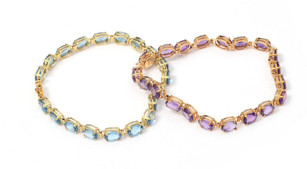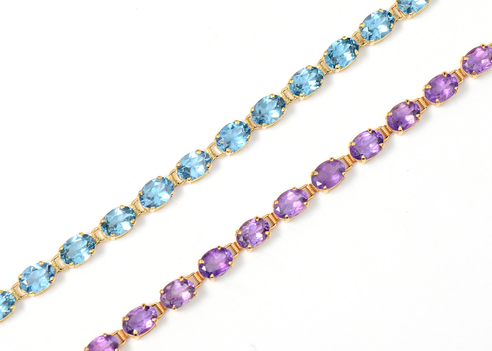 2 GEM STONE TENNIS BRACELETS AMETHYST AND TOPAZ: 1) 14K yellow gold bracelet contains oval mixed cut amethysts totaling approx. 10.00 Ct. The amethyst are prong set. Gold weight: 5.4 grams. Length: 7'' 2) 14K yellow gold bracelet contains oval mixed cut blue topaz totaling approx. 13.00 Ct. The topaz are prong set. Gold weight: 6.3 grams. Length: 7''