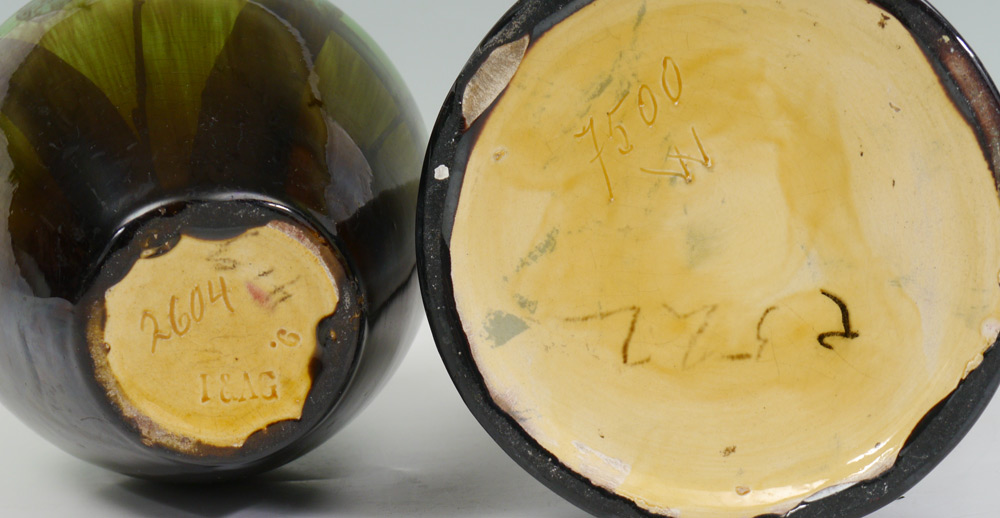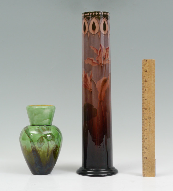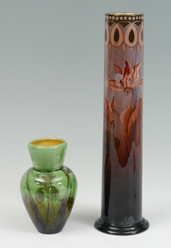2 PIECE FLORAL ART POTTERY VASES: 2 pieces total to include 1) Tall tapered cylindrical form vase with iris flowers motif, purples and dark green glaze. Unknown marks on base. 17'' h. x 4 1/2''. 2) Green glaze vase with flared rim, iris flower motif, impressed mark on base I & AG, 2604. 7 1/4'' h. x 4 1/2''.