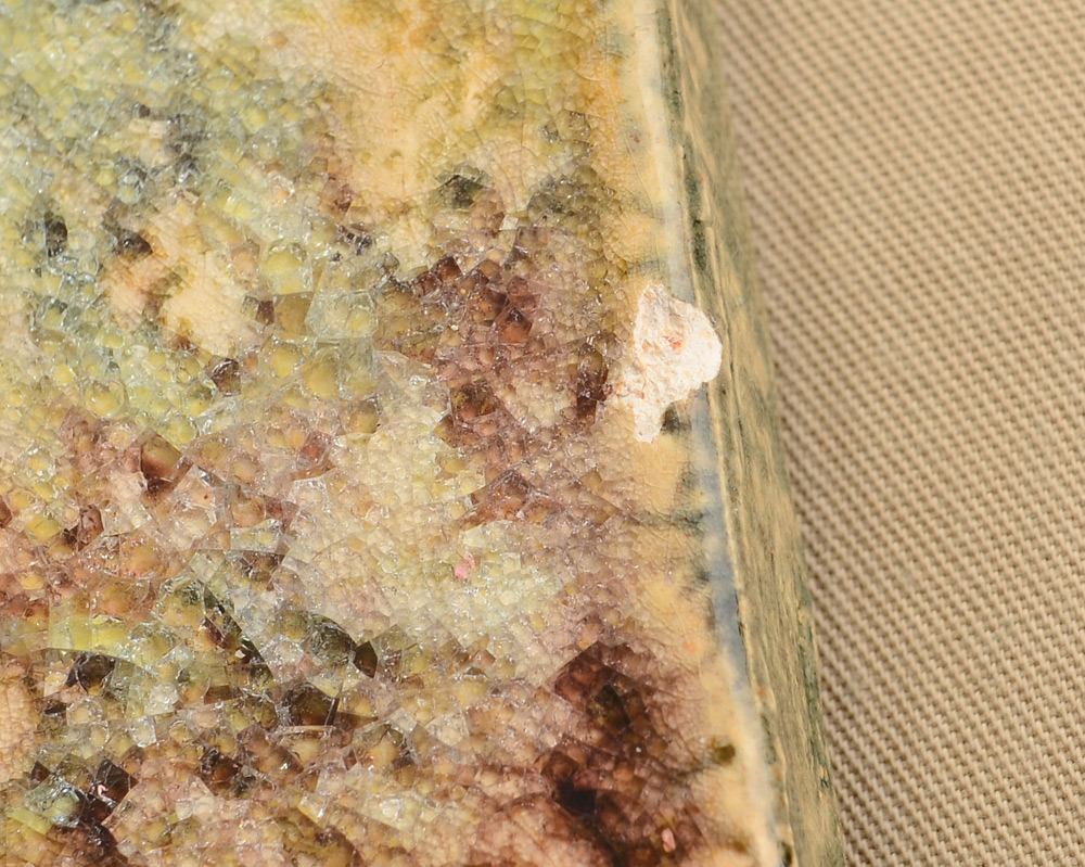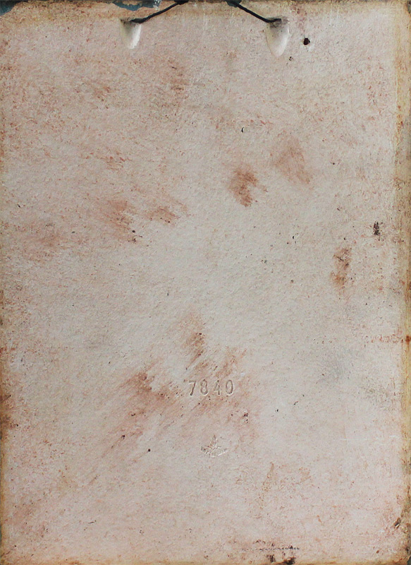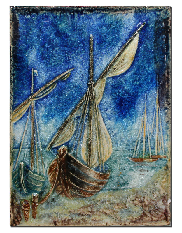 MAJOLICA GERMAN PORCELAIN SHIP PLAQUE: Relief plaque of ships at shore with rich majolica glaze. Illegible German mark on back KARL-?. impressed 7840. Overall 13 1/4'' h. x 10''.