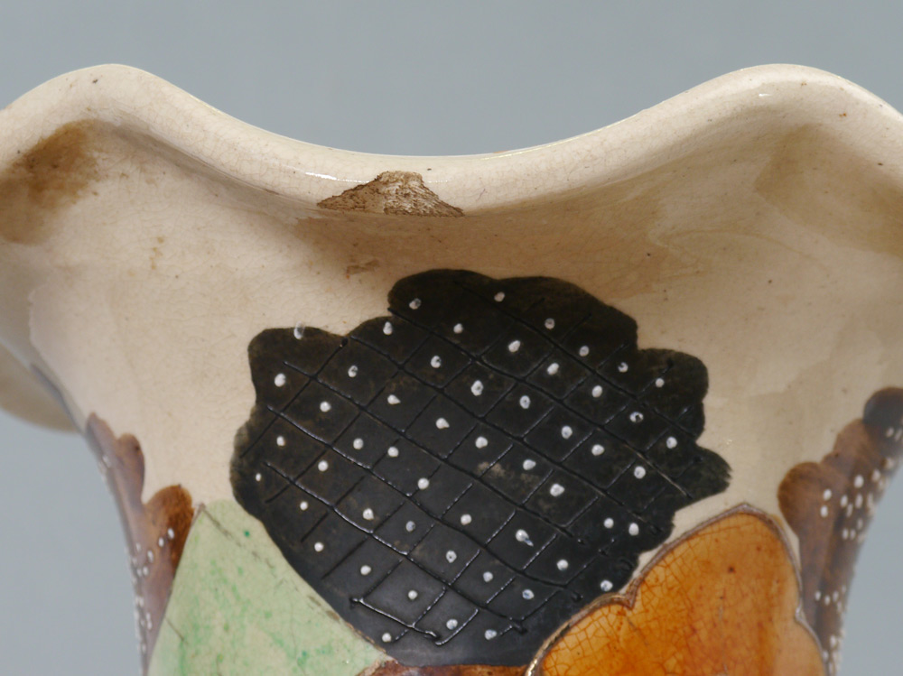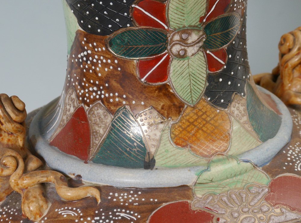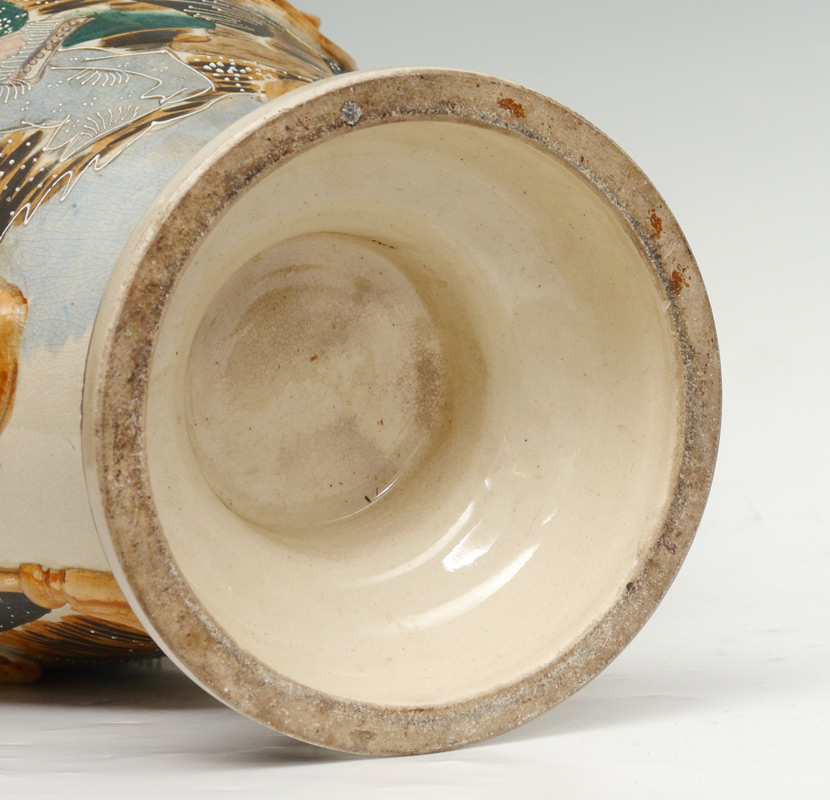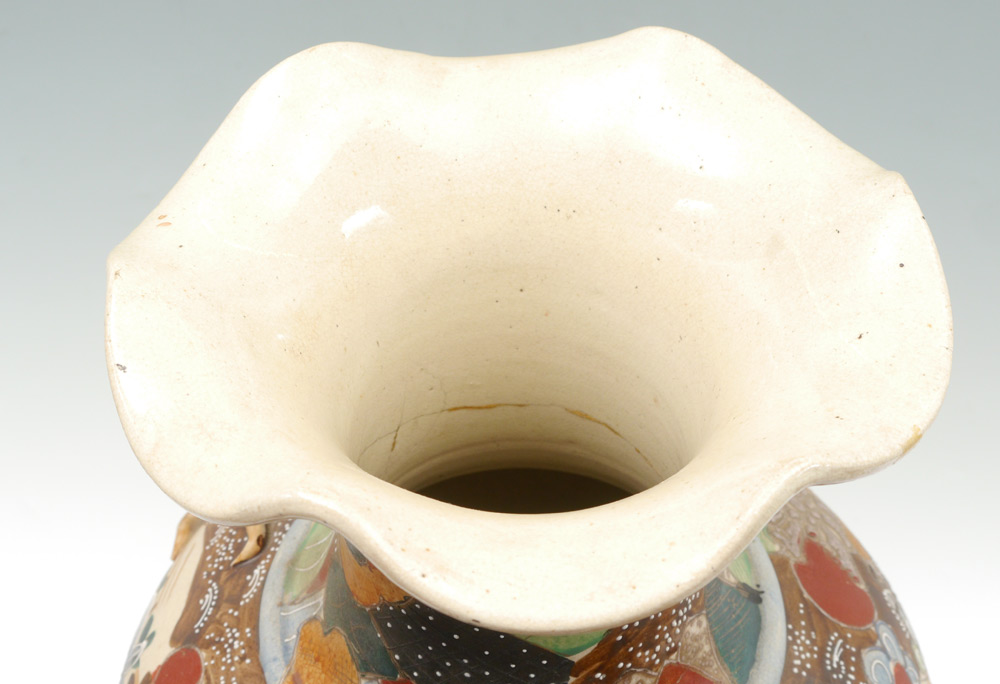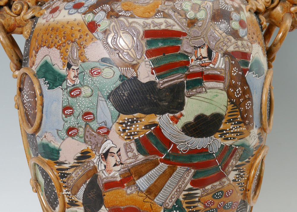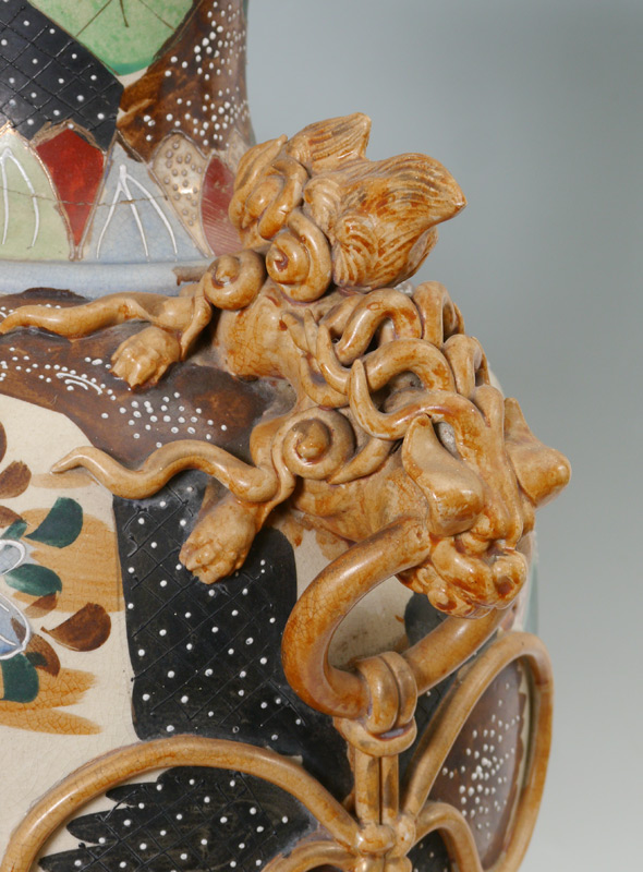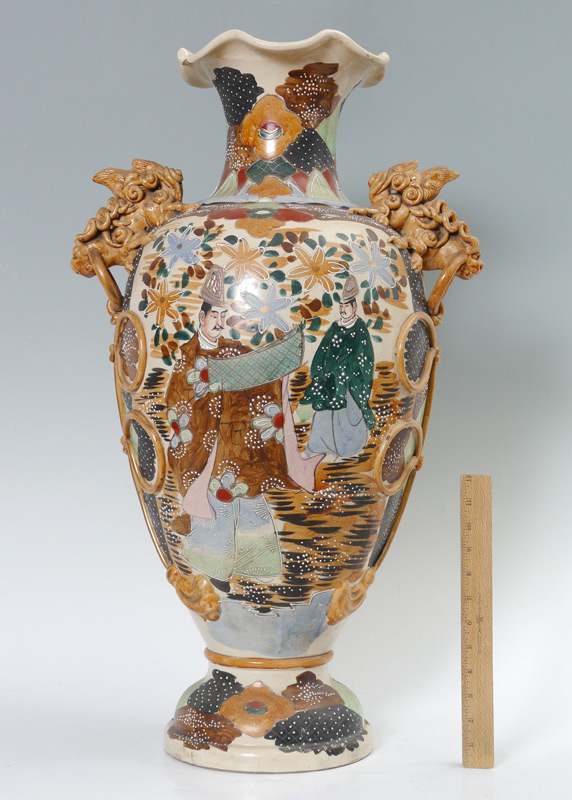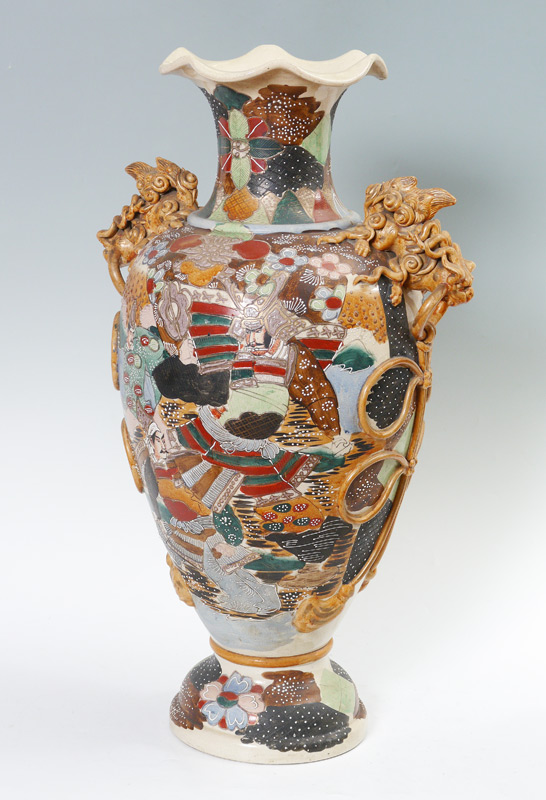 JAPANESE SATSUMA FIGURAL HANDLE VASE: Large vase with ruffled rim, applied figural mythological creature handles, scene of scholars on one side, warriors on the other. Unmarked, 30'' h. x 17 1/2''.