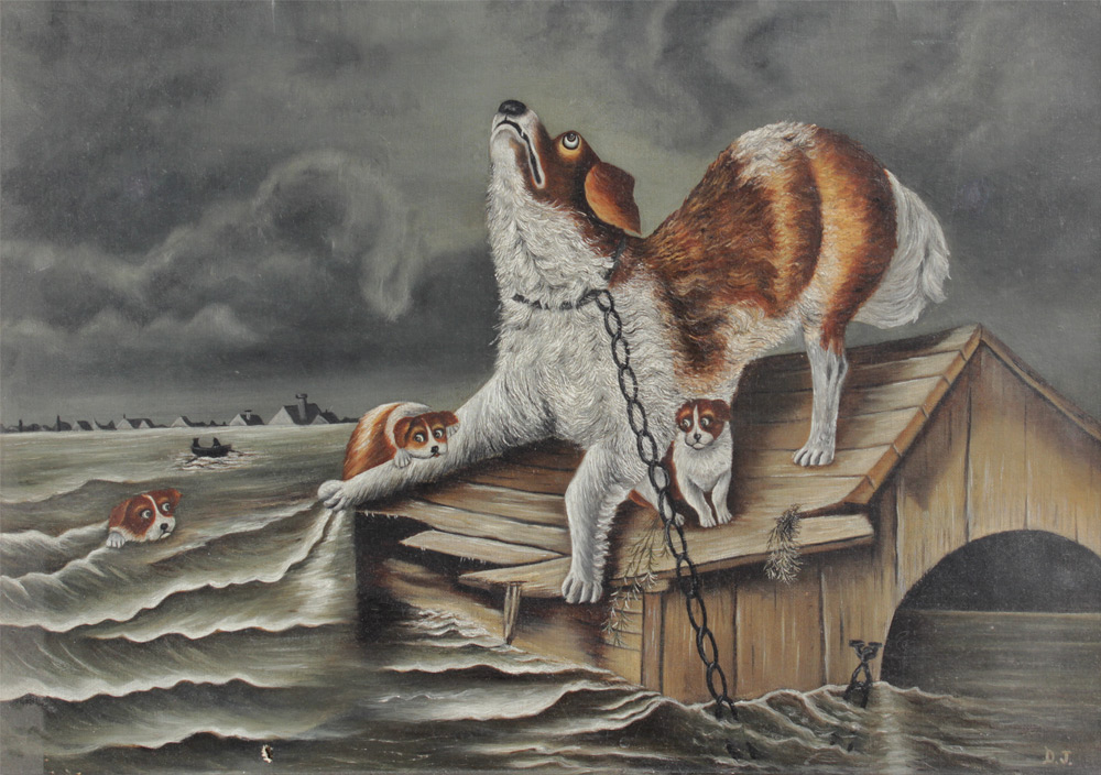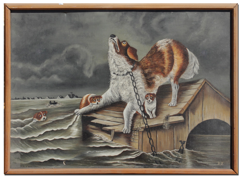 PRIMITIVE DRAMATIC PAINTING OF MOTHER DOG & HER PUPS IN A STORM: Oil/Canvas, 16'' x 22'', monogrammed lower right D.J., unframed.