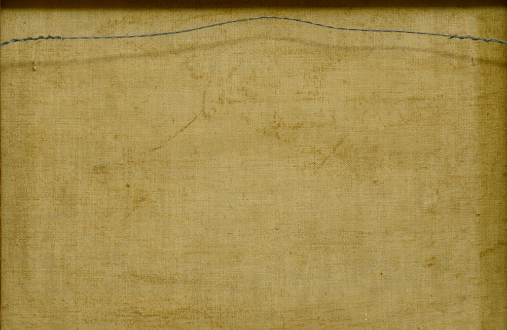 CONDITION: Puncture in the lower left corner, stretcher bar wear, needs cleaning, mild craquelure.