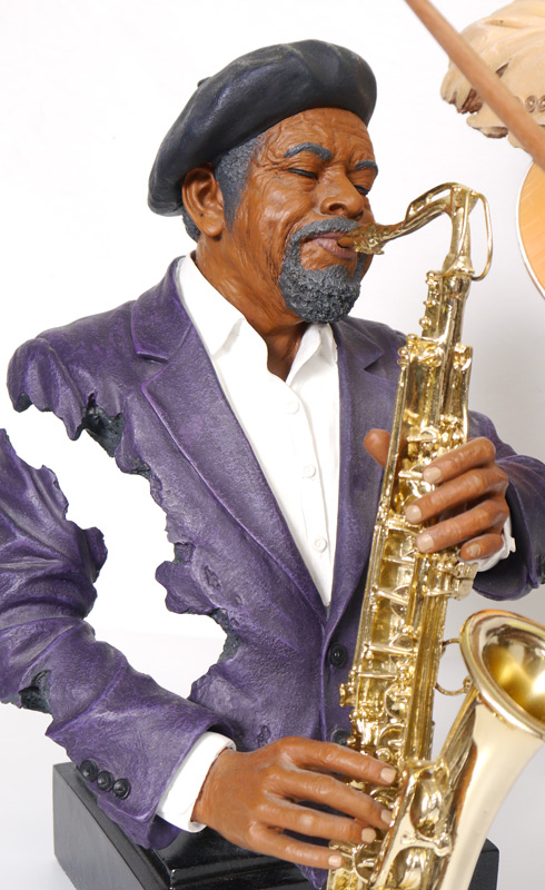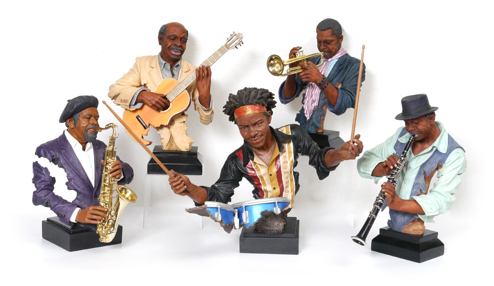 CONTEMPORARY CAST RESIN JAZZ BAND: 5 piece jazz ensemble figural busts, nicely detailed from the facial expressions to the different instruments. Drummer including sticks measures approx. 21'' x 24''.