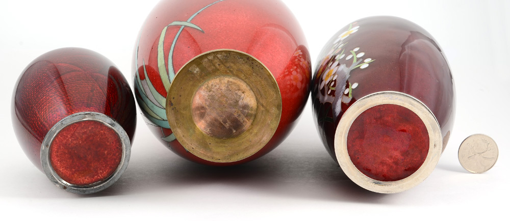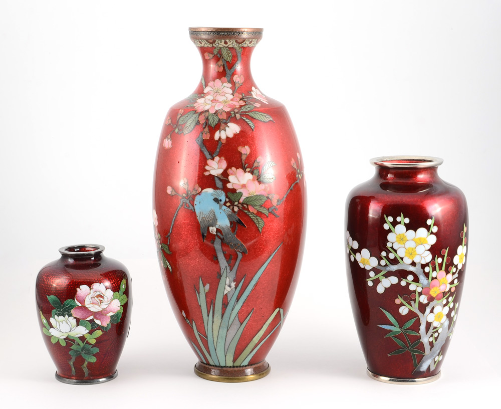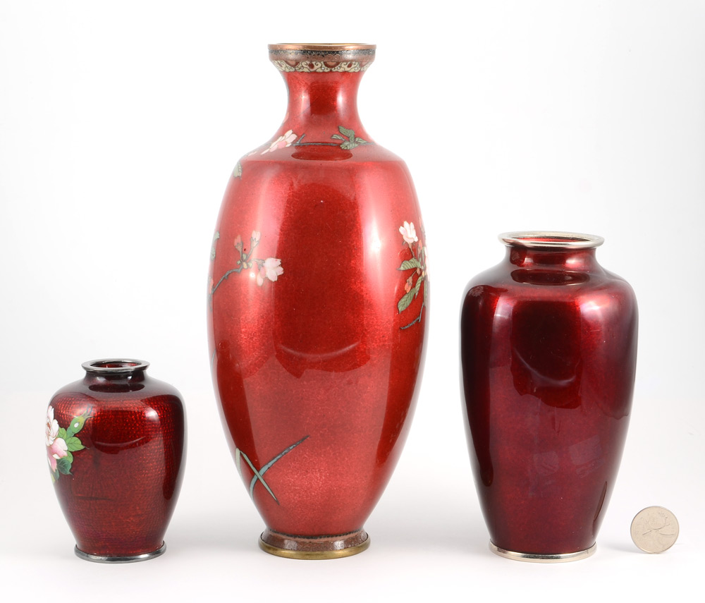 3 PIECE RED CLOISONNE VASES: An assembled collection, each with floral decoration, tallest with additional bird decoration, 9 3/8'' h. x 4''.
