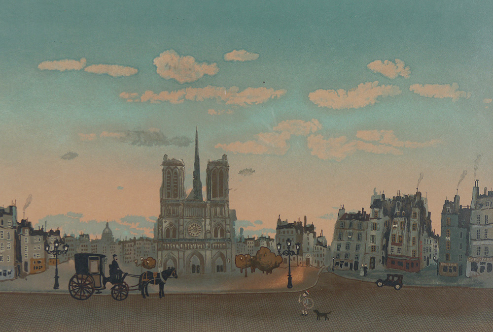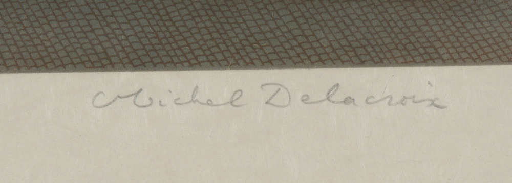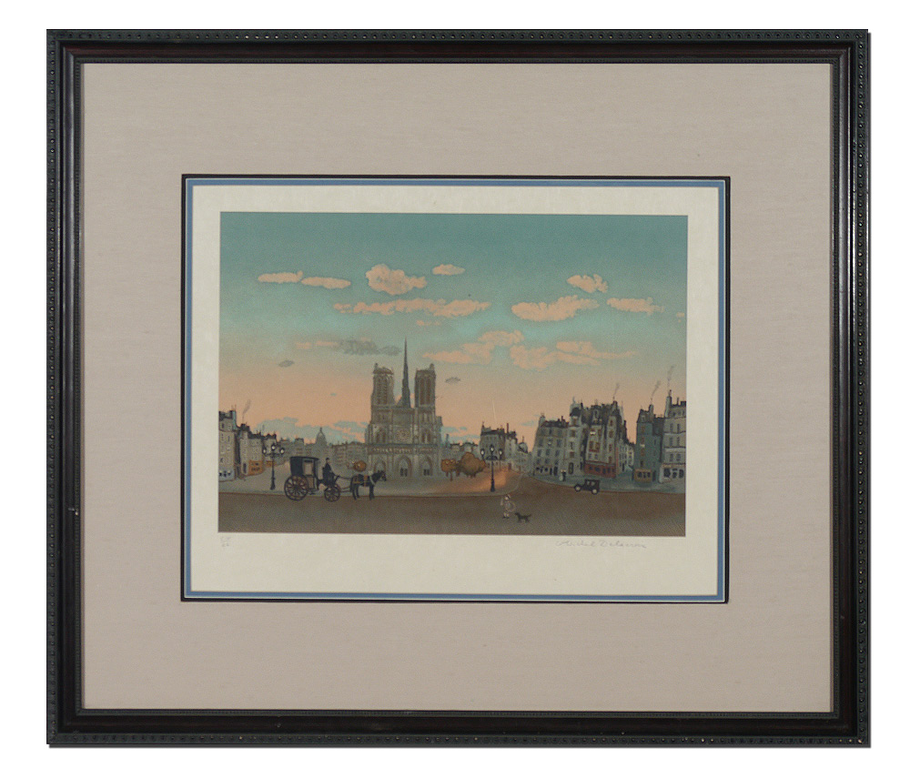 DELACROIX, Michel, (French, 1933- ): Paris Street Scene with Norte Dame in the background, Lithograph, Sight size 14 1/2'' x 19'', pencil signed lower right, 104/150, custom frame 26 1/2'' x 30''.