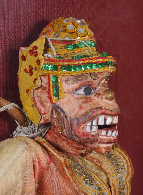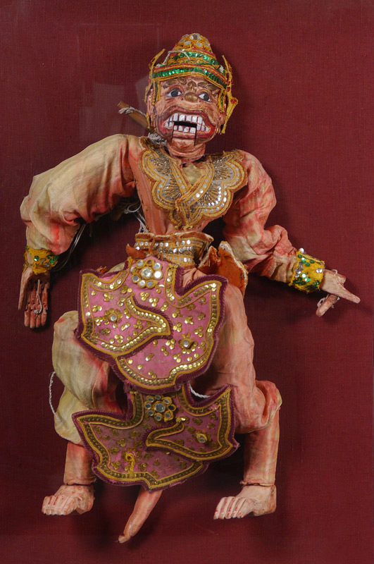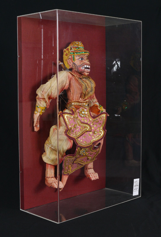 THAI CARVED MONKEY PUPPET IN LUCITE SHADOWBOX: Southeast Asian, most likely Thai, figure of a monkey in traditional garb. Encased in Lucite box, 30 1/2'' h. x 19 1/4'' x 9 1/2''.