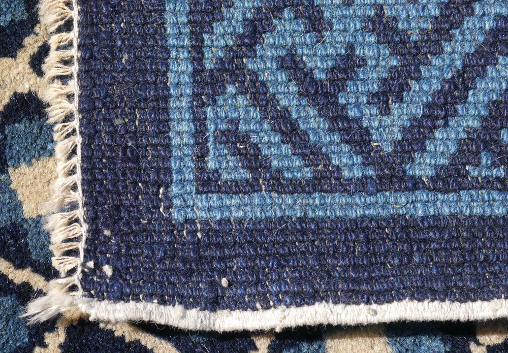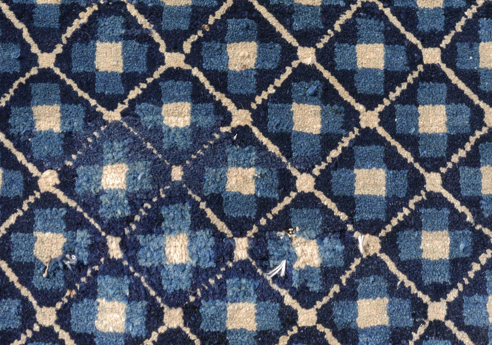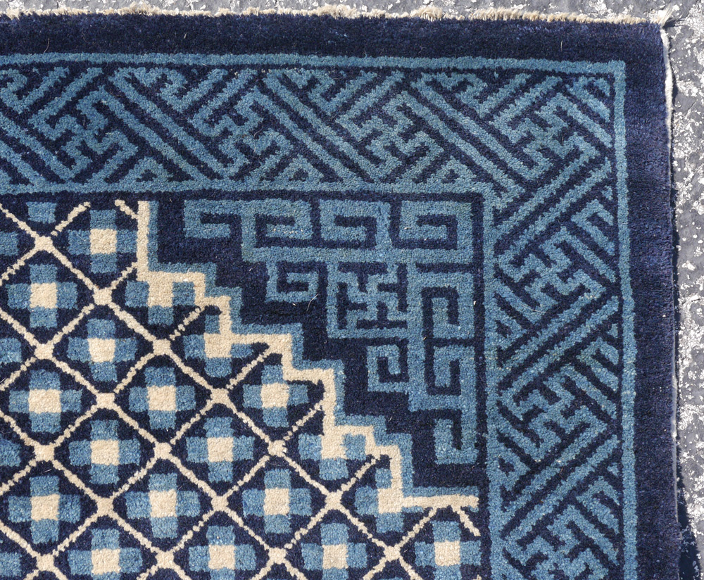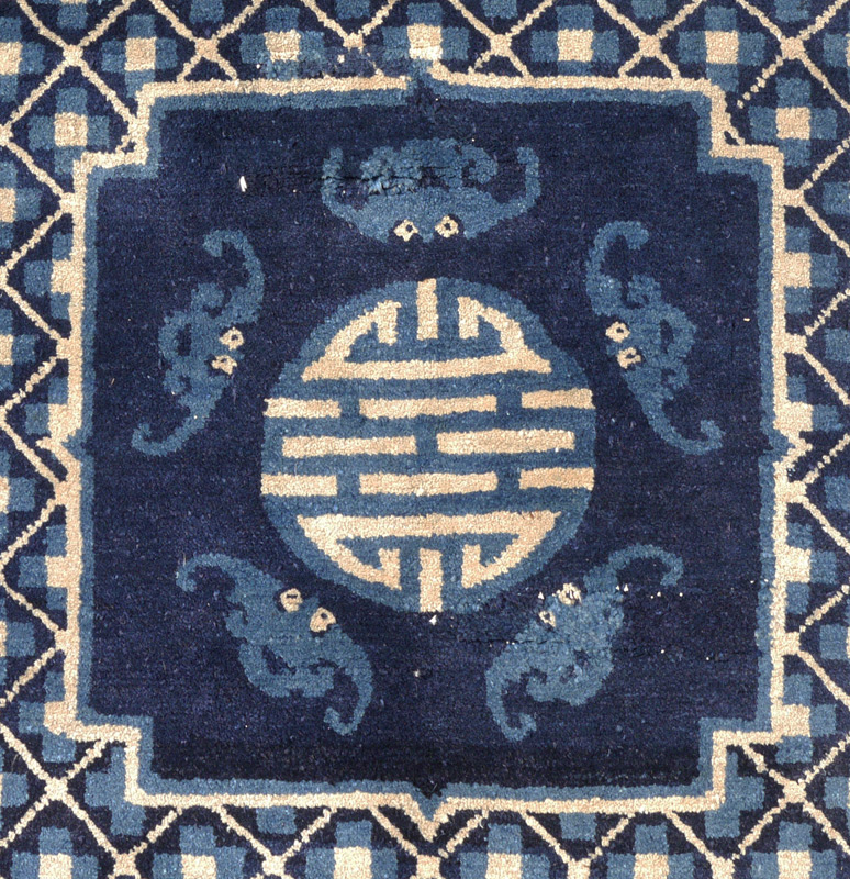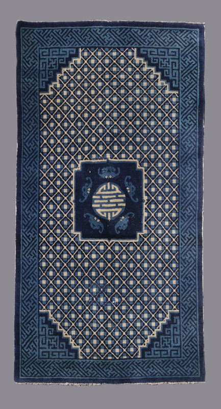 SEMI-ANTIQUE CHINESE HAND KNOTTED WOOL RUG, 3' 3'' x 5' 8'': This interesting rug has an ivory and blue lattice work design covering the main field of the rug with a small square dark blue medallion that has five bats around a Chinese symbol. The balance of the rug has two toned blue designs.