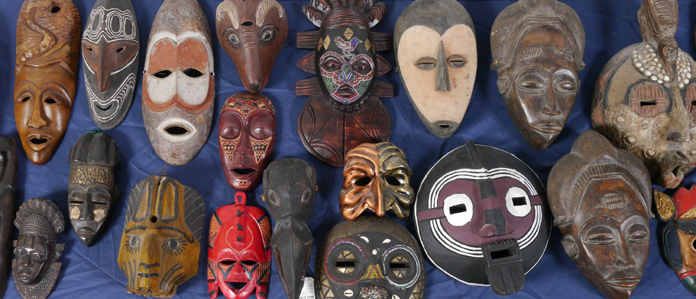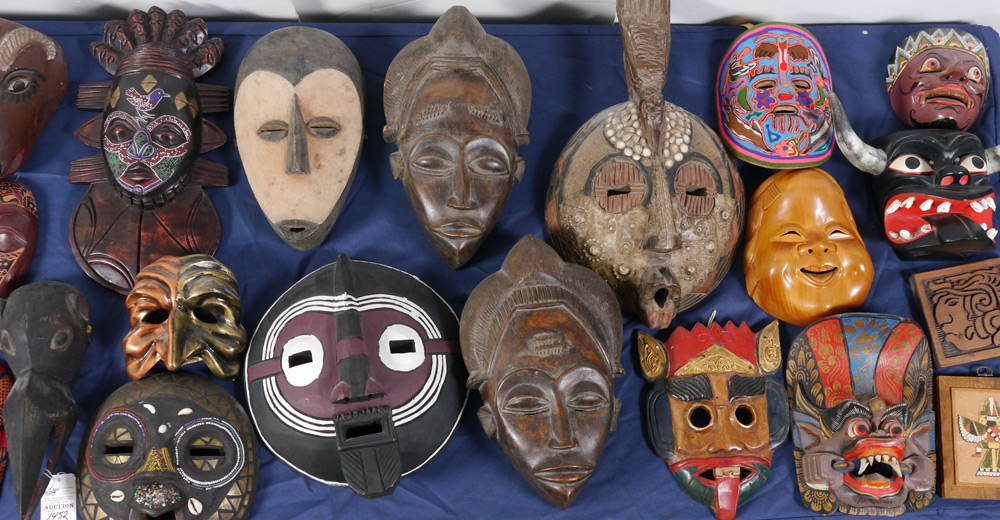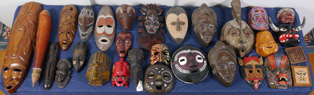 LARGE COLLECTION OF DECORATIVE MASKS: 26 carved and decorated masks from all over the world, primarily from Africa and New Guinea, largest measures 31'' h. x 8''. Sold with a gourd water bottle, 2 small wall plaques.