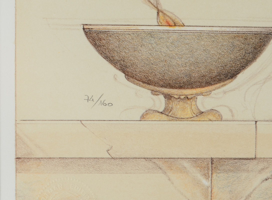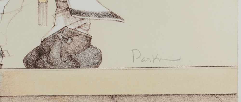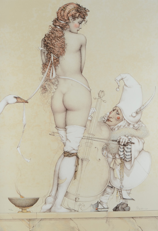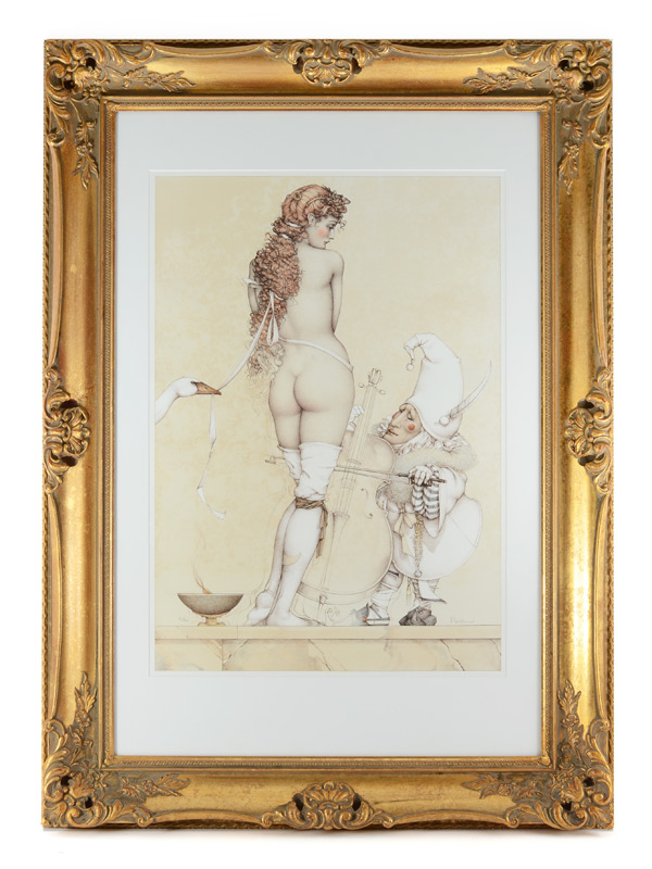PARKES, Michael, (American, 1944- ): '' Music Master'', Young Female Nude with Cello & Dwarf, Lithograph, Sight size 27 1/2'' x 19 1/4'', pencil signed lower right, #'d lower left 74/160, carved and gilded frame 44'' x 32''.