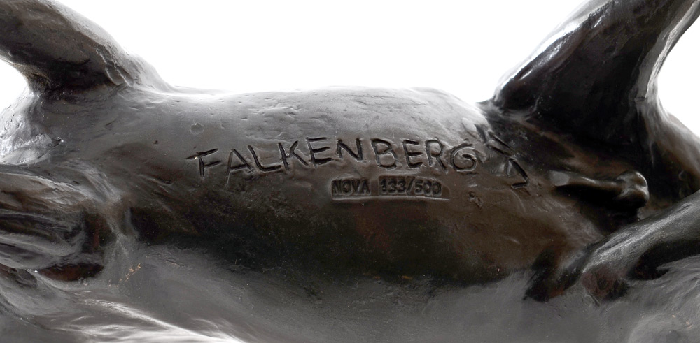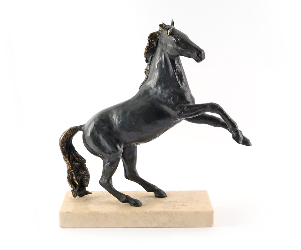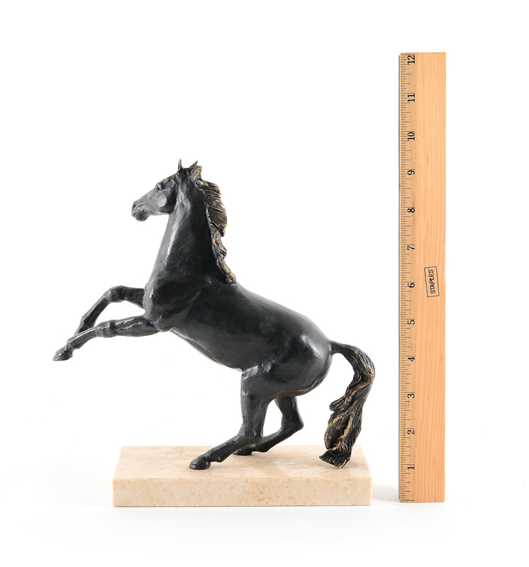 FALKENBERG REARING STALLION BRONZE SCULPTURE: 8 1/2'' h., incised signature, stamped Nova, #'d 253/500, affixed to a white marble plinth.
