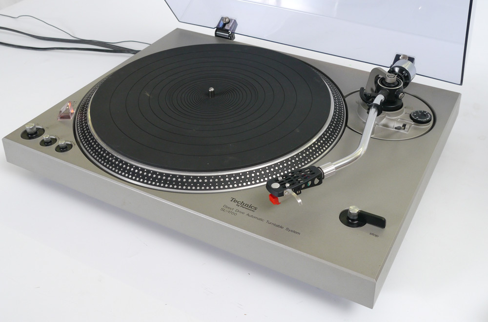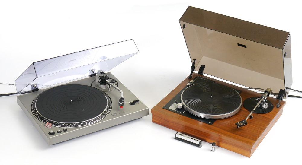 2 PIECE TECHNICS & CONNOISSEUR TURNTABLES: To include 1) Technics SL-1700, Direct Drive turnable with head shell and cartridge. Overall 4 1/2'' h. x 17 3/4'' x 14''. 2) A. R. Sugden BD-1 Connoisseur belt drive turntable with head shell and cartridge. 6'' h. x 18'' x 15''. Both appear to be in fine playing condition.