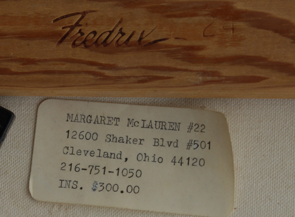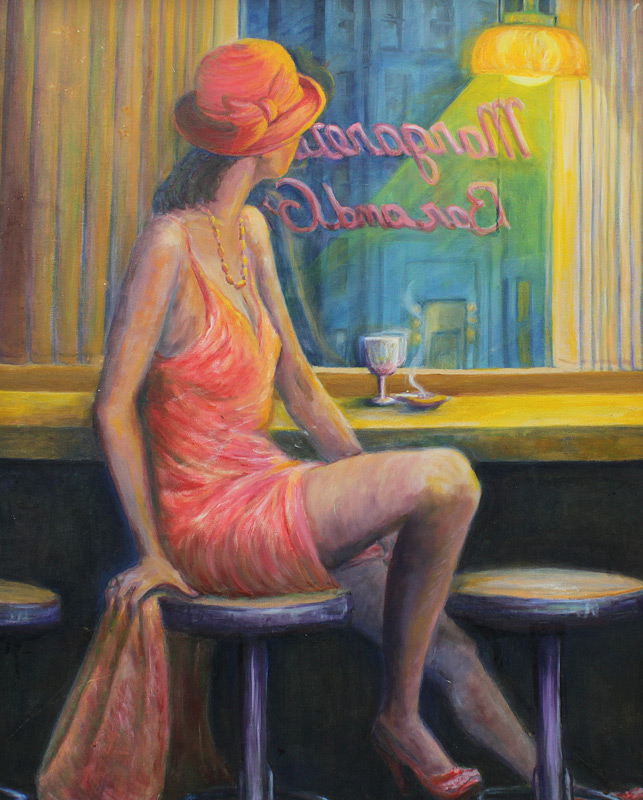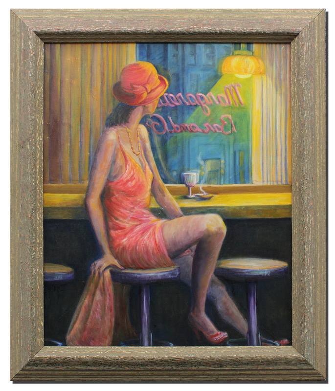 McLAURAN, Margaret, (American, 20th Century): 20's Era Scene with a Young Female Seated on a Bar Stool Looking out a Window, Waiting, Oil/Canvas, 24'' x 20'', unsigned, original label affixed verso, framed 27'' x 23''.