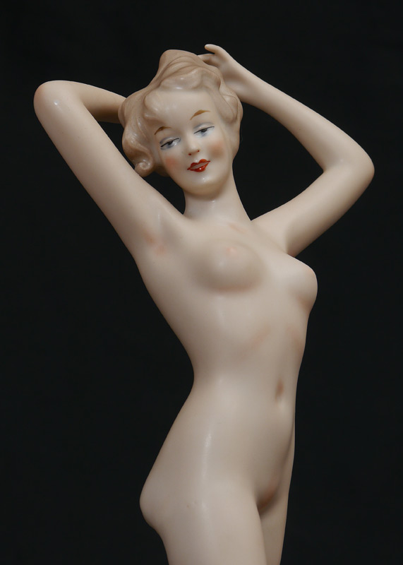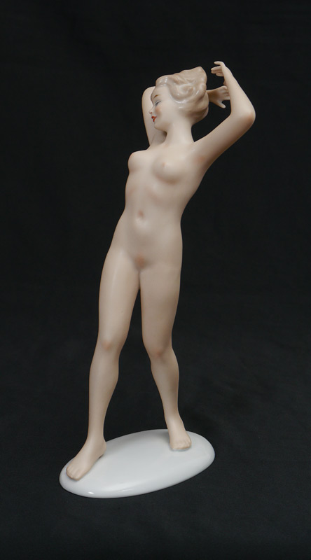 WALLENDORF STANDING NUDE PORCELAIN FIGURINE: Marked on base with green Wallendorf mark. 11'' h. x 2 3/4'' x 5 1/4''.