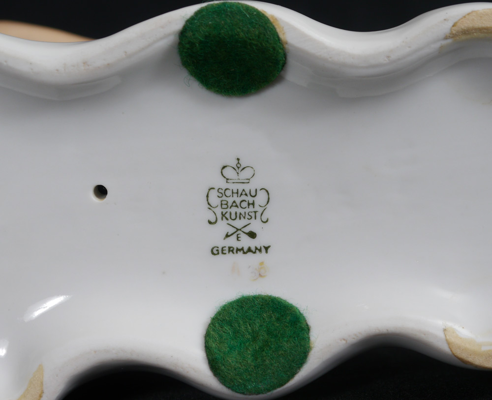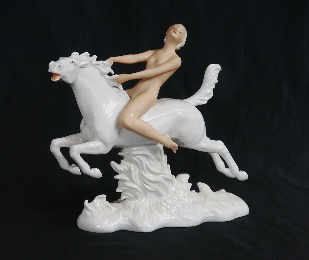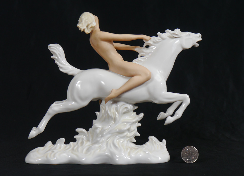 SCHAUBACH KUNST FIGURE OF NUDE ON HORSE: Nude figure riding white horse on the run. Marked on base. Measures 8 1/4'' h. x 9 1/2'' x 2 3/4''.